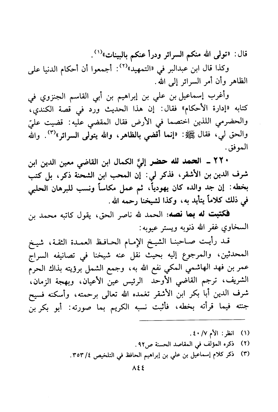 220 - الحمد لله حضر إليَّ الكمال ابن القاضي معين الدين ابن شرف الدين بن الأشقر، فذكر لي: إن المحب ابن الشحنة ذكر، بل كتب بخطه: إن جد والده كان يهوديًا، ثم عمل مكاسًا ونسب للبرهان الحلبي في ذلك كلامًا يتأيد به، وكذا لشيخنا رحمه الله.