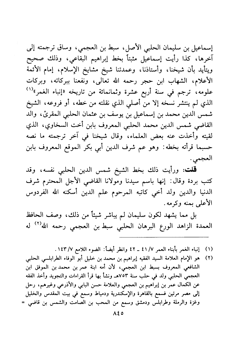 إسماعيل بن سليمان الحلبي الأصل، سبط بن العجمي، وساق ترجمته إلى آخرها، كذا رأيت إسماعيل مثبتًا بخط إبراهيم البقاعي، وذلك صحيح ويتأيد بأن شيخنا، وأستاذنا، وعمدتنا شيخ مشايخ الإسلام، إمام الأئمة الأعلام، الشهاب ابن حجر رحمه الله تعالى، ونفعنا ببركاته، وبركات علومه، نترجم في سنة أربع عشرة وثمانمائة من تاريخه "إنباء الغمر" الذي لم ينتشر نسخه إلا من أصلي الذي نقلته من خطه، أو فروعه، الشيخ شمس الدين محمد بن إسماعيل بن يوسف بن عثمان الحلبي المقرئ، والد القاضي شمس الدين محد الحلبي المعروف بابن أخت السخاوي، الذي لقيته وأخذت عنه بعض العلماء، وقال شيخنا في آخر ترجمته ما نصه حسبما قرأته بخطه: وهو عم شرف الدين أبي بكر الموقع المعروف بابن العجمي.