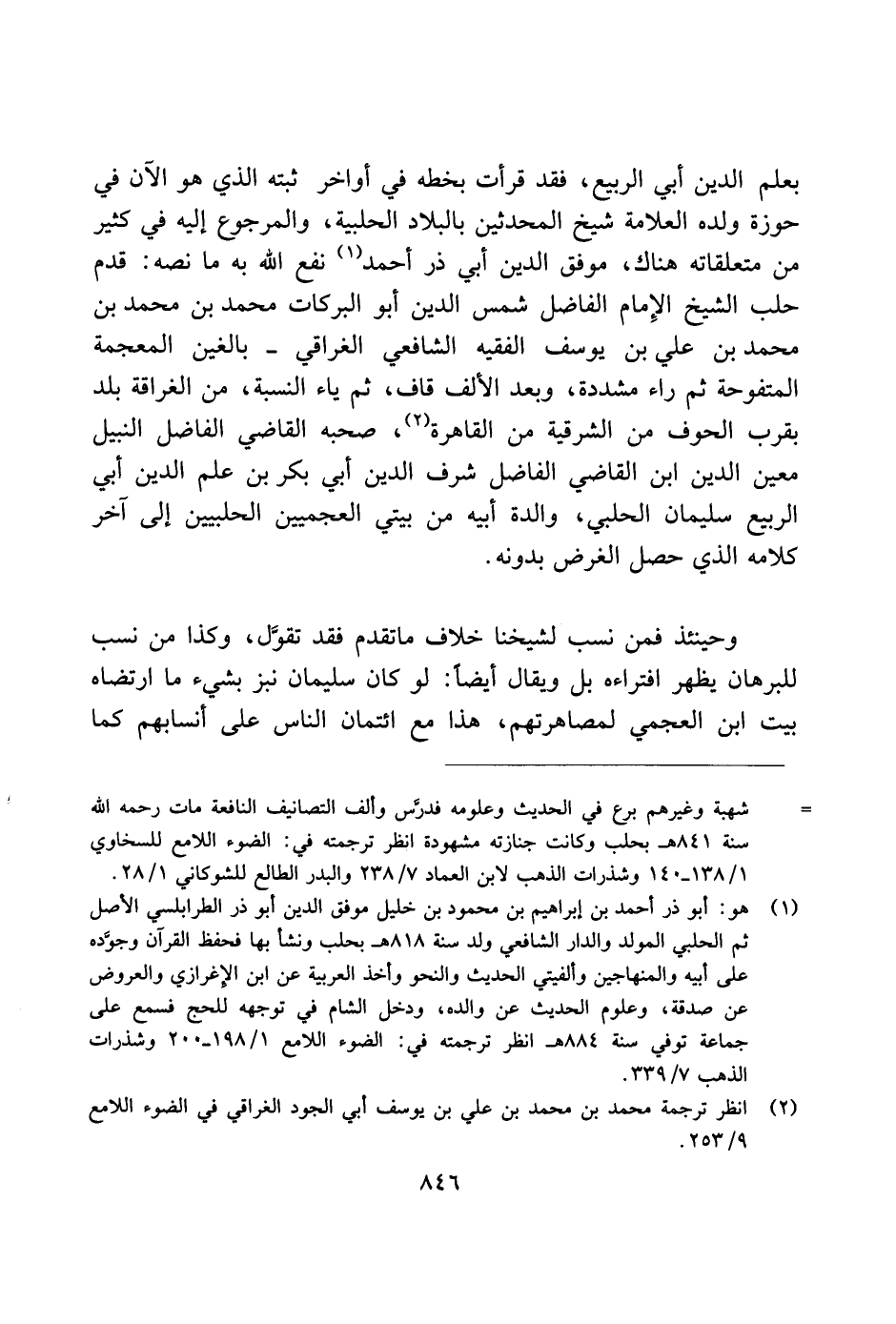 بعلم الدين أبي الربيع، فقد قرأت بخطه في أواخر ثبته الذي هو الآن في حوزة ولده العلامة شيخ المحدثين بالبلاد الحلبية، والمرجوع إليه في كثير من متعلقاته هناك، موفق الدين أبي ذر أحمد نفع الله به ما نصه: قدم حلب الشيخ الإمام الفاضل شمس الدين أبو البركات محمد بن محمد بن محمد بن علي بن يوسف الفقيه الشافعي الغراقي ـ بالغين المعجمة المتفوحة ثم راء مشددة، وبعد الألف قاف، ثم ياء النسبة، من الغراقة بلد بقرب الحوف من الشرقية من القاهرة، صحبه القاضي الفاضل النبيل معين الدين ابن القاضي الفاضل شرف الدين أبي بكر بن علم الدين أبي الربيع سليمان الحلبي، والدة أبيه من بيتي العجميين الحلبييين إلى آخر كلامه الذي حصل الغرض بدونه.