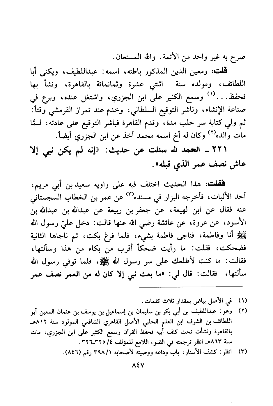 فقلت: هذا الحديث اختلف فيه على روايه سعيد بن أبي مريم، أحد الأثبات، فأخرجه البزار في مسنده عن عمر بن الخطاب السجستاني عنه فقال عن ابن لهيعة، عن جعفر بن ربيعة عن عبد الله بن عبد الله بن الأسود، عن عروة، عن عائشة رضي الله عنها قالت: دخل علي رسول الله صلى الله عليه وسلم أنا وفاطمة، فناجى فاطمة بشيء، فلما فرغ بكت، ثم ناجاها الثانية فضحكت، فقلت: ما رأيت ضحكًا أقرب من بكاء من هذا وسالتها، فقالت: ما كنت لأطلعك على سر رسول الله صلى الله عليه وسلم، فلما توفي رسول الله سألتها، فقالت: قال لي: "ما بعث نبي إلا كان من العمر نصف عمر