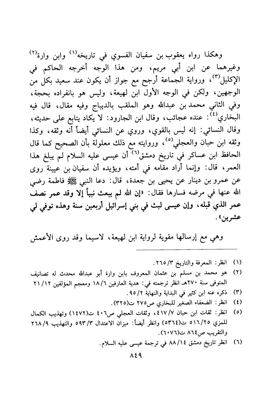 وهكذا رواه يعقوب بن سفيان الفسوي في تاريخه وابن وارة وغيرهما عن ابن أبي مريم، ومن هذا الوجه أخرجه الحاكم في الإكليل، ورواية الجماعة أرجح مع جواز أن يكون عند سعيد بكل من الوجهين، ولكن في الوجه الأول ابن لهيعة، وليس هو بانفراد بحجة، وفي الثاني محمد بن عبدالله وهو الملقب بالديباج وفيه مقال، قال فيه البخاري: عنده عجائب، وقال ابن الجارود: لا يكاد يتابع على حديثه، وقال النسائي: إنه ليس بالقوي، وروي عن النسائي أيضًا أنه وثقه، وكذا وثقه ابن حبان والعجلي، وروايته مع ذلك معلولة بأن الصحيح كما قال الحافظ ابن عساكر في تاريخ دمشق أن عيسى عليه السلام لم يبلغ هذا العمر، قال: وإنما أراد مقامه في أمته، ويؤيده أن سيان بن عيينة روى عن عمرو بن دينار عن يحيى بن جعدة، قال: دعا النبي صلى الله عليه وسلم فاطمة رضي الله عنها في مرضه فسارها فقال: "إن الله لم يبعث نبيًا إلا وقد عمر نصف عمر الذي قبله، وإن عيسى لبث في بني إسرائيل أربعين سنة وهذه توفي لي عشرين".