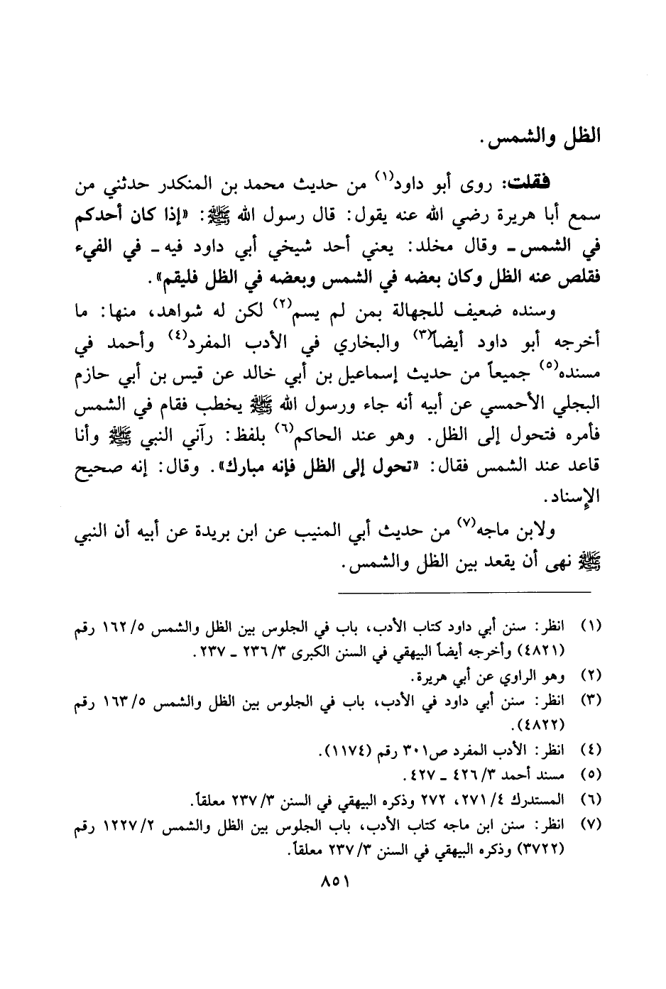 فقلت: روى أبو داود من حديث محمد بن المنكدر حدثني من سمع أبا هريرة رضي الله عنه يقول: قال رسول الله صلى الله عليه وسلم: "إذا كان أحدكم في الشمس ـ وقال مخلد: يعني أحد شيخي أبي داود فيه ـ في الفيء فقلص عنه الظل وكان بعضه في الشمس وبعضه في الظل فليقم".