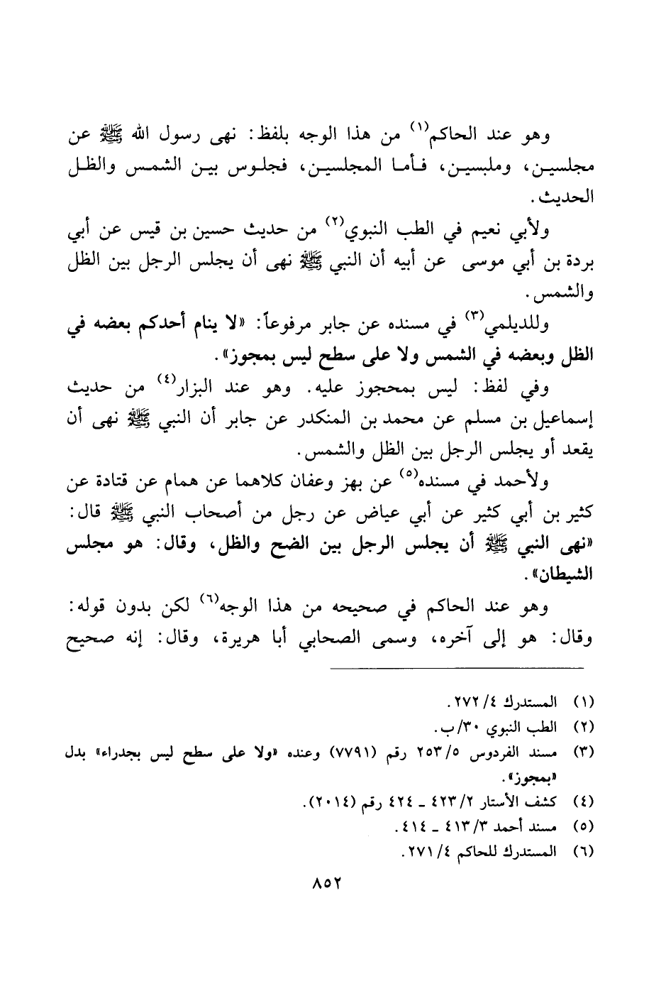ولأبي نعيم في الطب النبوي من حديث حسين بن قيس عن أبي بردة بن أبي موسى عن أبيه أن النبي صلى الله عليه وسلم نهى أن يجلس الرجل بين الظل والشمس.