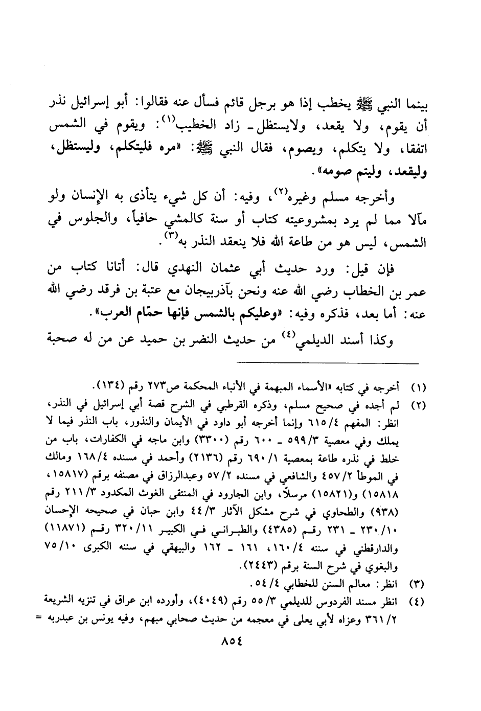 بينما النبي صلى الله عليه وسلم يخطب إذا هو برجل قائم فسأل عنه فقالوا: أبو إسرائيل نذر أن يقوم، ولا يقعد، ولا يستظل ـ زاد الخطيب: ويقوم في الشمس اتفقا، ولا يتكلم، ويصوم، فقال النبي صلى الله عليه وسلم: "مره فليتكلم، وليستظل، وليقعد، وليتم صومه".