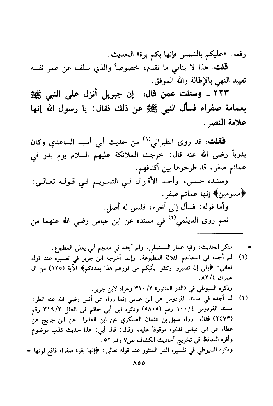 223 - وسئلت عمن قال: إن جبريل أنزل على النبي صلى الله عليه وسلم بعمامة صفراء فسأل النبي صلى الله عليه وسلم عن ذلك فقال: يا رسول الله إنها علامة النصر.