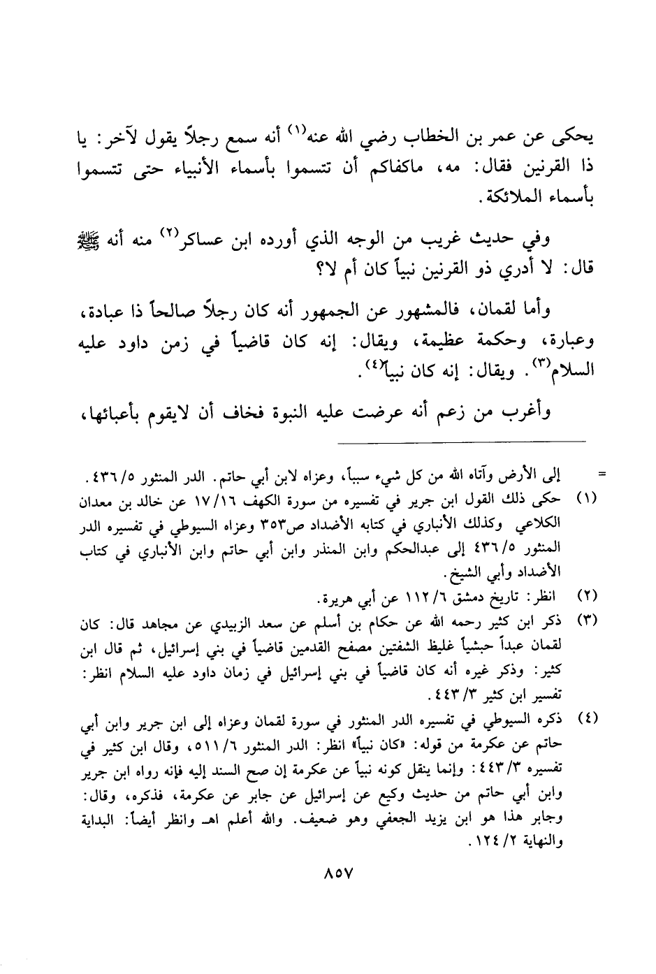 يحكى عن عمر بن الخطاب رضي الله عنه أنه سمع رجلاً يقول لآخر: يا ذا القرنين فقال: مه، ما كفاكم أن تتسموا بأسماء الأنبياء حتى تتسموا بأسماء الملائكة.
