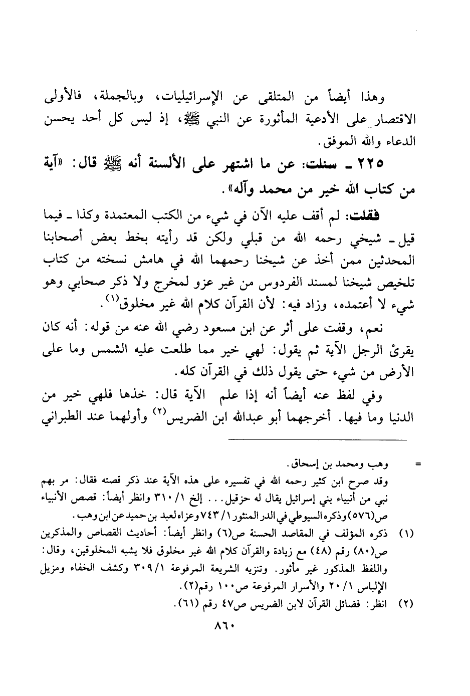 فقلت: لم أقف عليه الآن في شيء من الكتب المعتمدة وكذا ـ فيما قيل ـ شيخي رحمه الله من قبلي ولكن قد رأيته بخط بعض أصحابنا المحدثين ممن أخذ عن شيخنا رحمهما الله في هامش نسخته من كتاب تلخيص شيخنا لمسند الفردوس من غير عزو لمخرج ولا ذكر صحابي وهو شيء لا أعتمده، وزاد فيه: لأن القرآن كلام الله غير مخلوق.