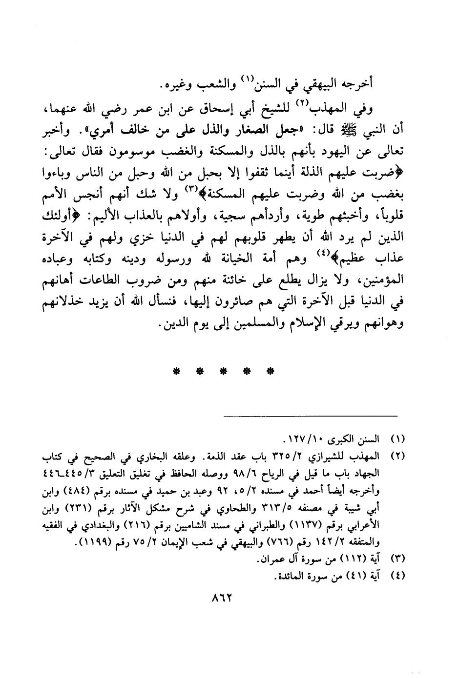 وفي المهذب للشيخ أبي إسحاق عن ابن عمر رضي الله عنهما، أن النبي صلى الله عليه وسلم قال: "جعل الصغار والذل على من خالف أمري". وأخبر تعالى عن اليهود بأنهم بالذل والمسكنة والغضب موسومون فقال تعالى: (ضربت عليهم الذلة أينما ثقفوا إلا بحب لمن الله وحبل من الناس وباءوا بغضب من الله وضربت عليهم المسكنة) ولا شك أنهم أنجس الأمم قلوبًا، وأخبثهم طوية، وأردأهم سجية، وأولادهم بالعذاب الأليم: (أولئك عذاب عظيم) وهم أمة الخيانة لله ورسوله ودينه وكتابه وعباده المؤمنين، ولا يزال يطلع على خائنة منهم ومن ضروب الطاعات أهانهم في الدنيا قبل الآخرة التي هم صائرون إليها، فنسأل الله أن يزيد خذلاتهم وهوانهم ويرقي الإسلام والمسلمين إلى يوم الدين.