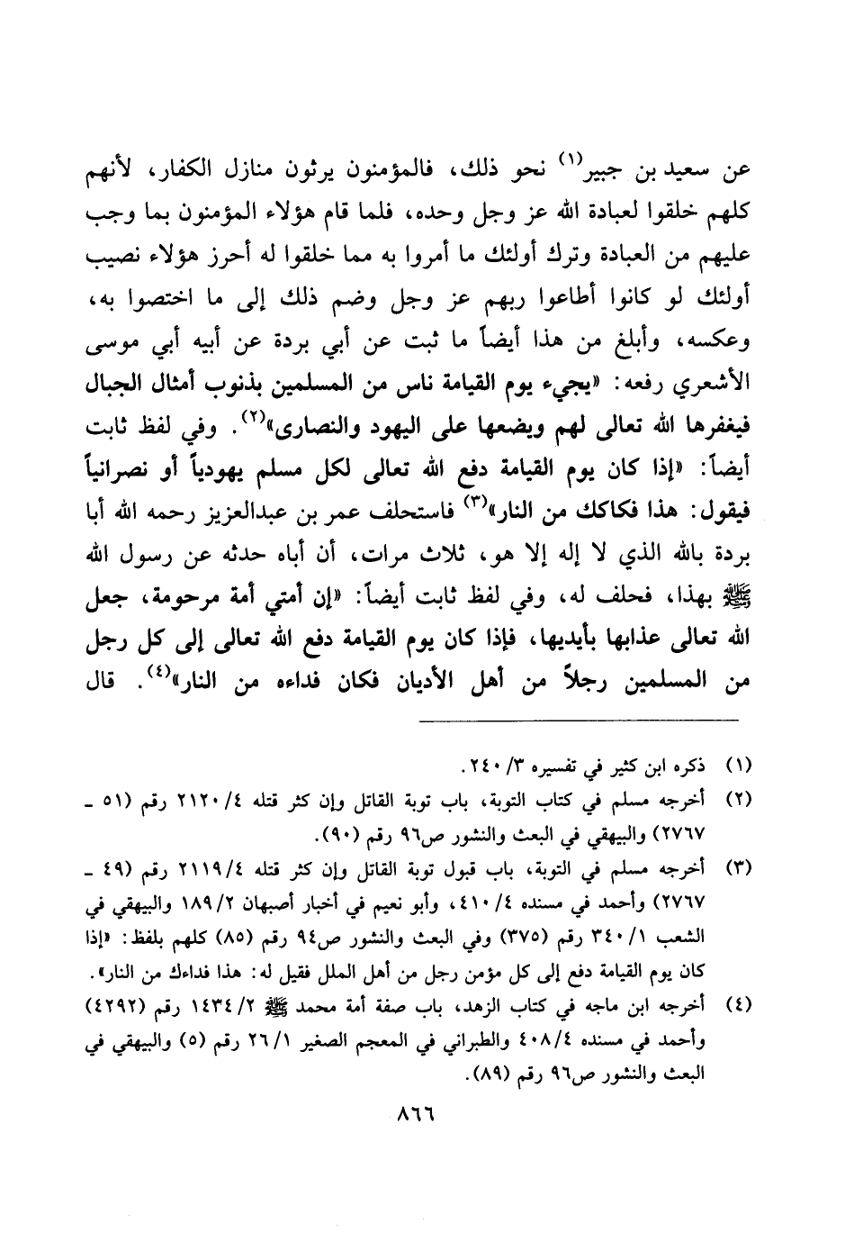 عن سعيد بن جبير نحو ذلك، فالمؤمنون يرثون منازل الكفار، لأنهم كلهم خلقوا لعبادة الله عز وجل وحده، فلما قام هؤلاء المؤمنين بما وجب عليهم من العبادة وترك أولئك ما أمروا به مما خلقوا له أحرز هؤلاء نصيب أولئك لو كانوا أطاعوا ربهم عز وجل وضم ذلك إلى ما اختصوا به، وعكسه، وأبلغ من هذا أيضًا ما ثبت عن أبي بردة عن أبيه أبي موسى الأشعري رفعه: "يجيء يوم القيامة ناس من المسلمين بذنوب أمثال الجبال فيغفرها الله تعالى لهم ويضعها على اليهود والنصارى". وفي لفظ ثابت أيضًا: "إذا كان يوم القيامة دفع الله تعالى لكل مسلم يهوديًا أو نصرانيًا فيقول: هذا فكاكك من النار" فاستحلف عمر بن عبد العزيز رحمه الله أبا بردة بالله الذي لا إله إلا هو، ثلاث مرات، أن أباه حدثه عن رسول الله صلى الله عليه وسلم بهذا، فحلف له، وفي لفظ ثابت أيضًا: "إن أمتي أمة مرحومة، جعل الله تعالى عذابها بأيديها، فإذا كان يوم القيامة دفع الله تعالى إلى كل رجل من المسلمين رجلاً من أهل الأديان كان فداءه من النار". قال