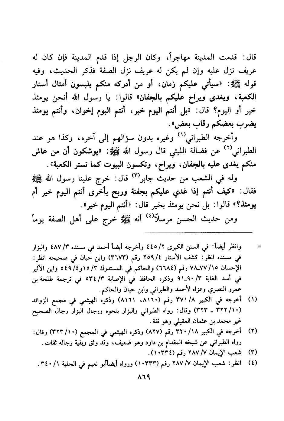 قال: قدمت المدينة مهاجرًا، وكان الرجل إذا قدم المدينة فإن كان له عريف نزل عليه وإن لم يكن له عريف نزل الصفة فذكر الحيدث، وفيه قوله صلى الله عليه وسلم: "سيأتي عليكم زمان، أو من أدركه منكم يلبسون أمثال أستار الكعبة، ويغدى ويراج عليكم بالجفان" قالوا: يا رسول الله أنحن يومئذ خير أو اليوم؟ قال: "بل أنتم اليوم خير، أنتم اليوم إخوان، وأنتم يومئذ يضرب بعضكم رقاب بعض".