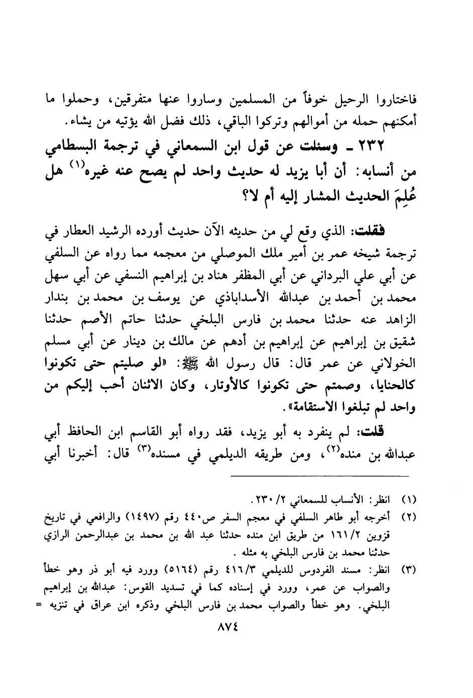232 - وسئلت عن قول ابن السمعاني في ترجمة البسطامي من أنسابه: أن ابا يزيد له حديث واحد لم يصح عنه غيره هل عُلِمَ الحديث المشار إليه أم لا؟