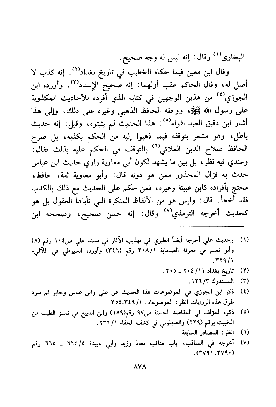 وقال بن معين فيما حكاه الخطيب في تاريخ بغداد: إنه كذب لا أصل له، وقال الحاكم عقب أولهما: إنه صحيح الإسناد. وأورده ابن الجوزي من هذين الوجهين في كتابه الذي أفرده للأحاديث المكذوبة على رسول الله صلى الله عليه وسلم، ووافقه الحافظ الذهبي وغيره على ذلك، وإلى هذا أشار ابن دقيق العيد بقوله: هذا الحديث لم يثبتوه، وقيل: إنه صرح الحافظ صلاح الدين العلائي بالتوقف في الحكم عليه بذلك فقال: وعندي فيه نظر، بل بين ما يشهد لكون أبي معاوية راوي حديث ابن عباس حديث به فزال المحذور ممن هو دونه قال: وأبو معاوية ثقة، حافظ، محتج بأفراده كابن عيينة وغيره، فمن حكم على الحديث مع ذلك بالكذب فقد أخطأ. قال: وليس هو من الألفاظ المنكرة التي تأباها العقول بل هو كحديث أخرجه الترمذي وقال: إنه حسن صحيح، وصححه ابن