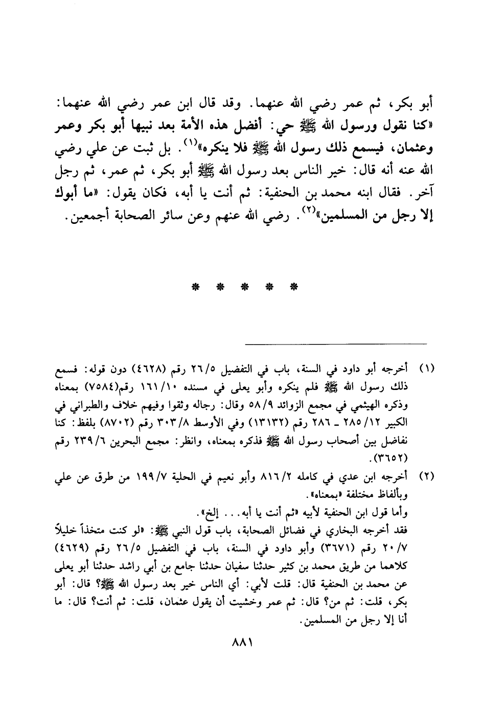 أبو بكر، ثم عمر رضي الله عنهما. وقد قال ابن عمر رضي الله عنهما: "كنا نقول ورسوله الله صلى الله عليه وسلم حي: أفضل هذه الأمة بعد نبيها أبو بكر وعمر وعثمان، فيسمع ذلك رسول الله صلى الله عليه وسلم فلا ينكره". بل ثبت عن علي رضي الله عنه أنه قال: خير الناس بعد رسول الله صلى الله عليه وسلم أبو بكر، ثم عمر، ثم رجل آخر. فقال ابنه محمد بن الحنفية: ثم أنت يا أبه، فكان يقول: "ما أبوك إلا رجل من المسلمين. رضي الله عنهم وعن سائر الصحابة أجمعين.