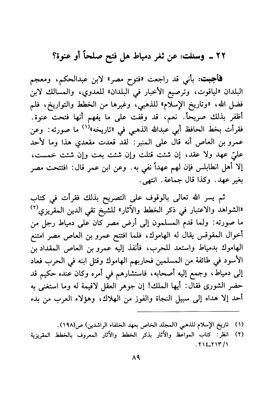 22 - وسئلت: عن ثغر دمياط هل فتح صلحًا أو عنوة؟