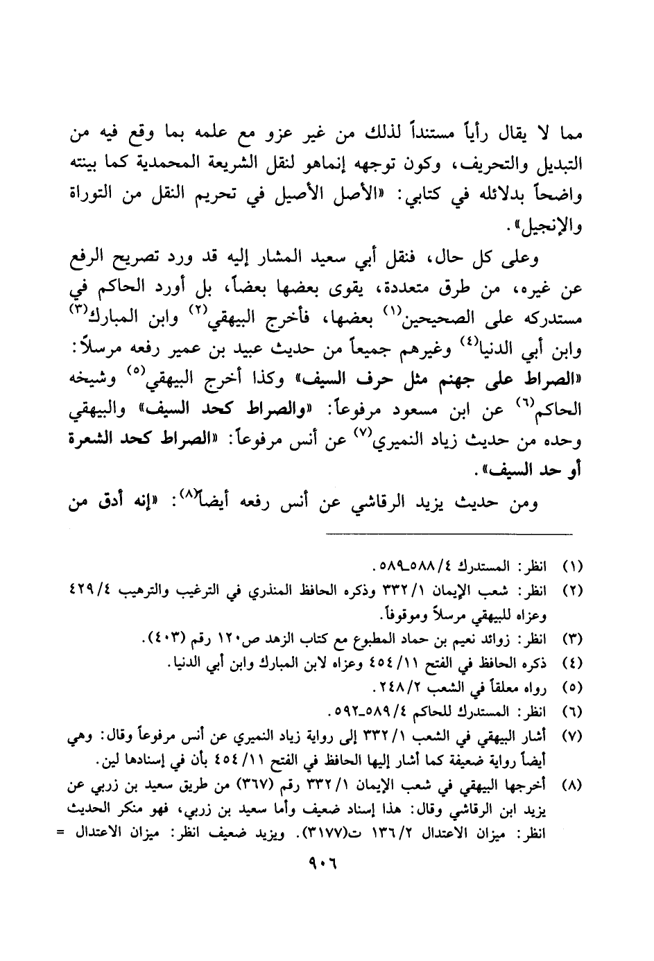 وعلى كل حال، فنقل أبي سعيد المشار إليه قد ورد تصريح الرفع عن غيره، من طرق متعددة، يقوي بعضها بعضًا، بل أورد الحاكم في مستدركه على الصحيحين بعضها، فأخرج البيهقي وابن المبارك وابن أبي الدنيا وغيرهم جميعًا من حديث عبيد بن عمير رفعه مرسلاً: "الصراط على جهنم مثل حرف السيف" وكذا أخرج البيهقي وشيخه الحام عن ابن مسعود مرفوعًا: "والصراط كحد السيف" والبيهقي وحده من حديث زياد النميري عن أنس مرفوعًا: "الصراط كحد الشعرة أو حد السيفط.