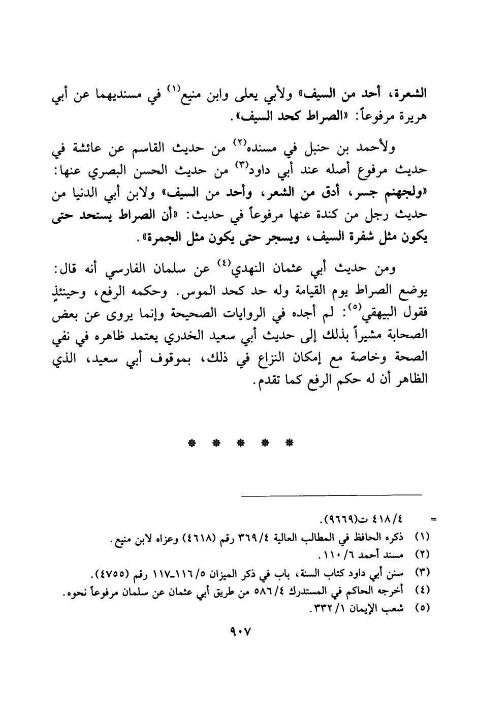 ومن حديث أبي عثمان النهدي عن سلمان الفارسي أنه قال: يوضع الصراط يوم القيامة وله كحد الموس. وحكمه الرفع، وحينئذٍ فقول البيهقي: لم أجده في الروايات الصحيحة وإنما يروى عن بعض الصحابة مشيرًا بذلك إلى حديث أبي سعيد الخدري يعتمد ظاهره في نفي الصحة وخاصة مع إمكان النزاع ي ذلك، بموقوف أبي سعيد، الذي الظاهر أن له حكم الرفع كما تقدم.