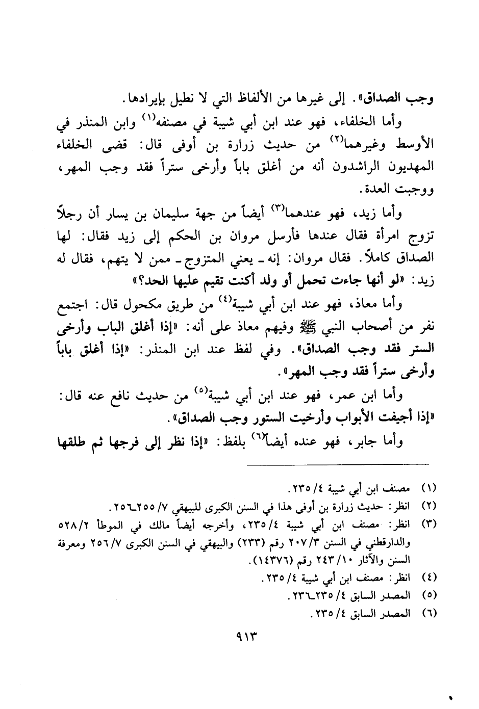 وأما الخلفاء، فهو عند ابن أبي شيبة في مصنفه وابن المنذر في الأوسط وغيرهما من حديث زرارة بن أوفى قال: قضى الخلفاء المهديون الراشدون أنه من أغلق بابًا وأرخى سترًا فقد وجب المهر، ووجبت العدة.