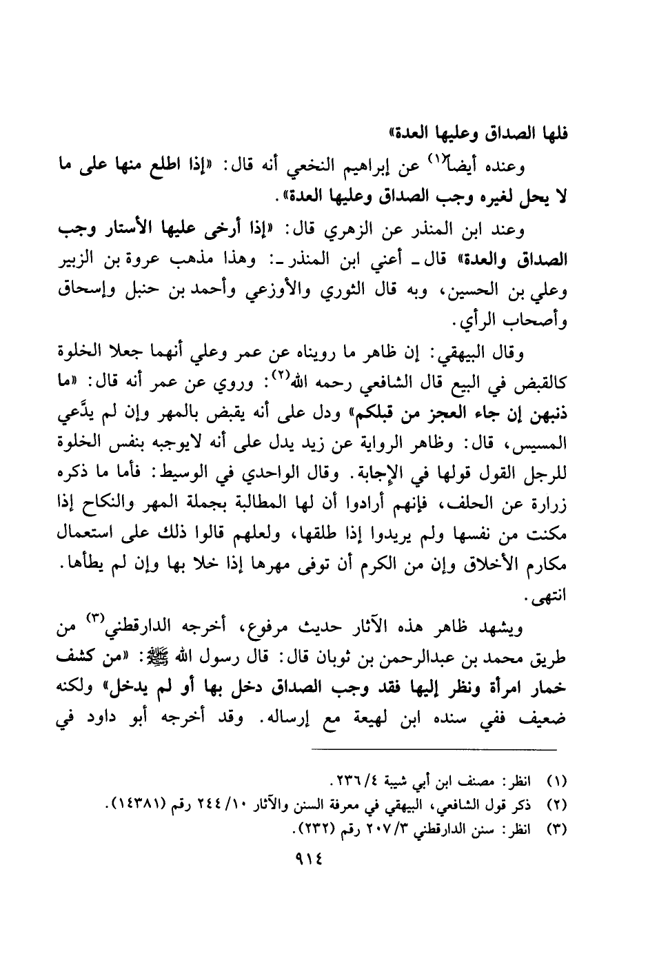 وقال البيهقي: إن ظاهر ما رويناه عن عمر وعلي أنهما جعلا الخلوة كالقبض في البيع قال الشافعي رحمه الله: وروي عن عمر أنه قال: "ما ذنبهن إن جاء العجز من قبلكم" ودل على أنه يقبض بالمهر وإن لم يدَّعي المسيس، قال: وظاهر الرواية عن زيد يدل على أنه لا يوجبه بنفس الخلوة للرجل القول قولها في الإجابة. وقال الواحدي في الوسيط: فإما ما ذكره زرارة عن الحلف، فإنهم أرادوا أن لها المطالبة بجملة المهر والنكاح إذا مكنت من نفسها ولم يريدوا إذا طلقها، ولعلهم قالوا ذلك على استعمال مكارم الأخلاق وإن من الكرم أن توفى مهرها إذا خلا بها وإن لم يطأها. انتهى.