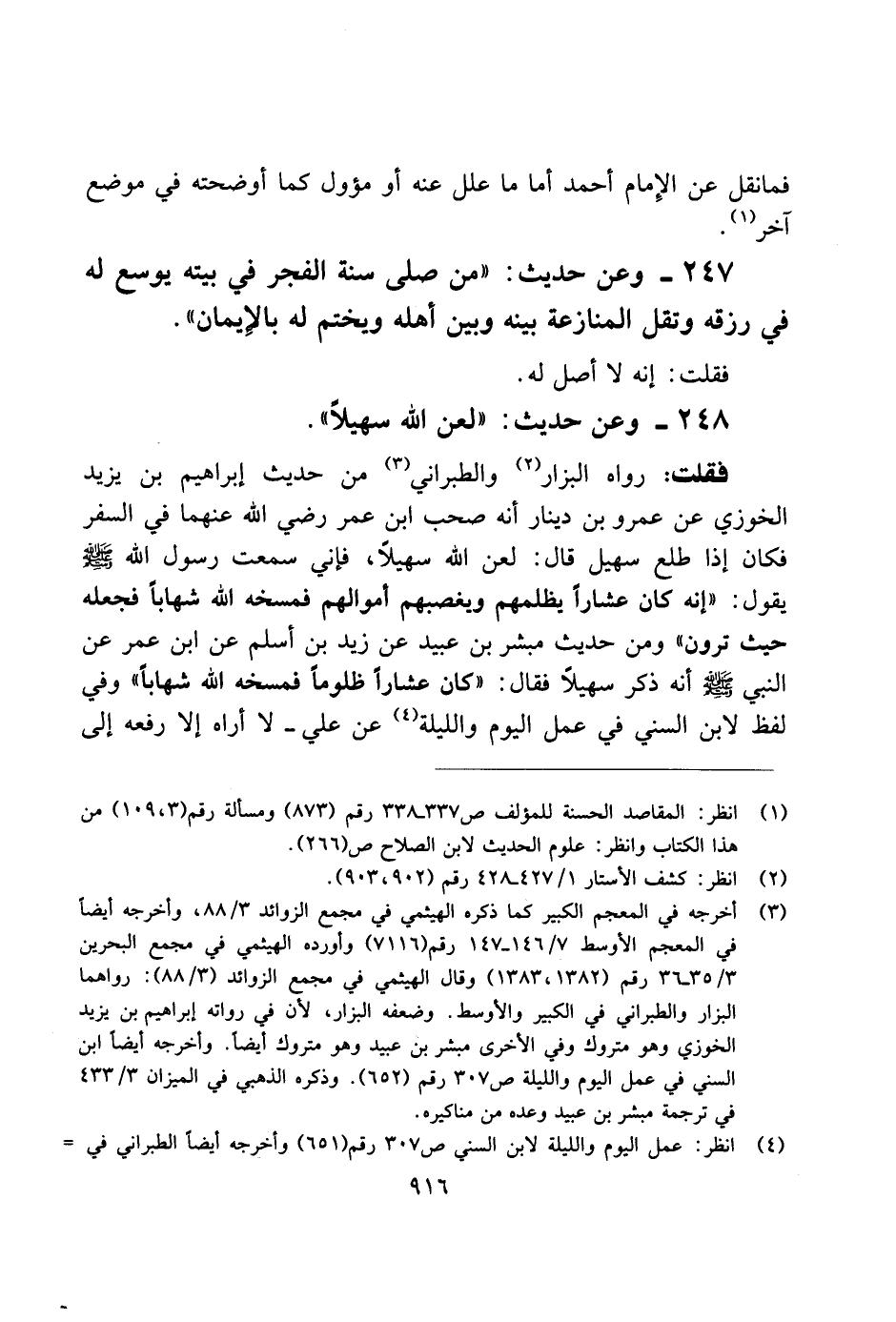 فقلت: رواه البزار والطبراني من حيدث إبراهيم بن يزيد الخوري عن عمرو بن دينار أنه صحب ابن عمر رضي الله عنهما في السفر فكان إذا طلع سهيل قال: لعن الله سهيلاً، فإنيسمعت رسول الله صلى الله عليه وسلم يقول: "إنه كان عشارًا يظلمهم ويغصبهم أموالهم فمسخه الله شهابًا فجعله حيث ترون" ومن حديث مبشر بن عبدي عن زيد بن أسلم عن ابن عمر عن النبي صلى الله عليه وسلم أنه ذكر سهيلاً فقال: "كان عشارًا ظلومًا فمسخه الله شهابًا" وفي لفظ لابن السني في عمل اليوم والليلة عن علي ـ لا أراه إلا رفعه إلى