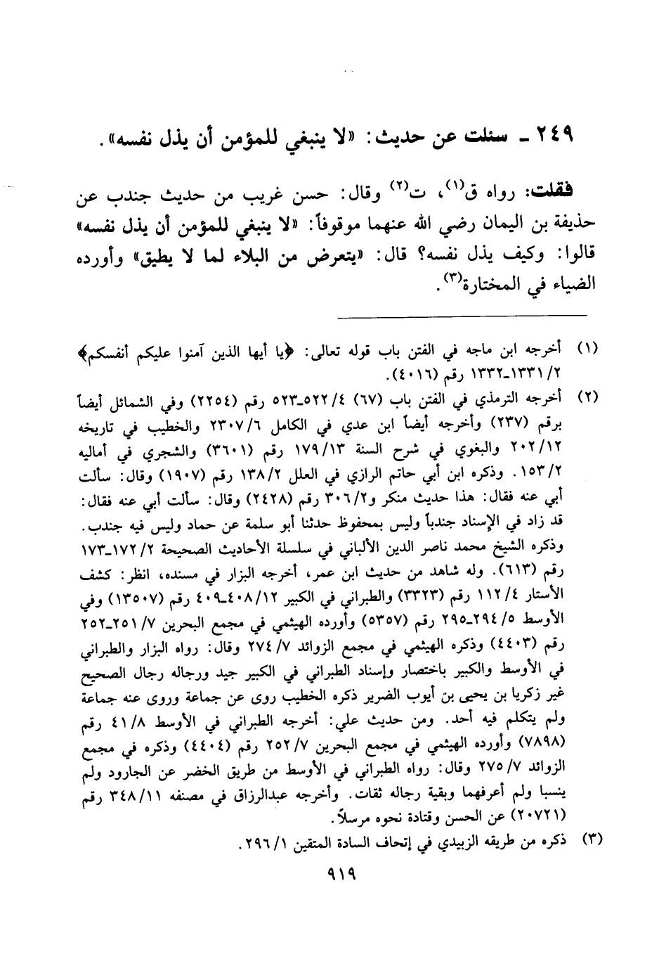249 - سئلت عن حديث: "لا ينبغي للمؤمن أني ذل نفسه".