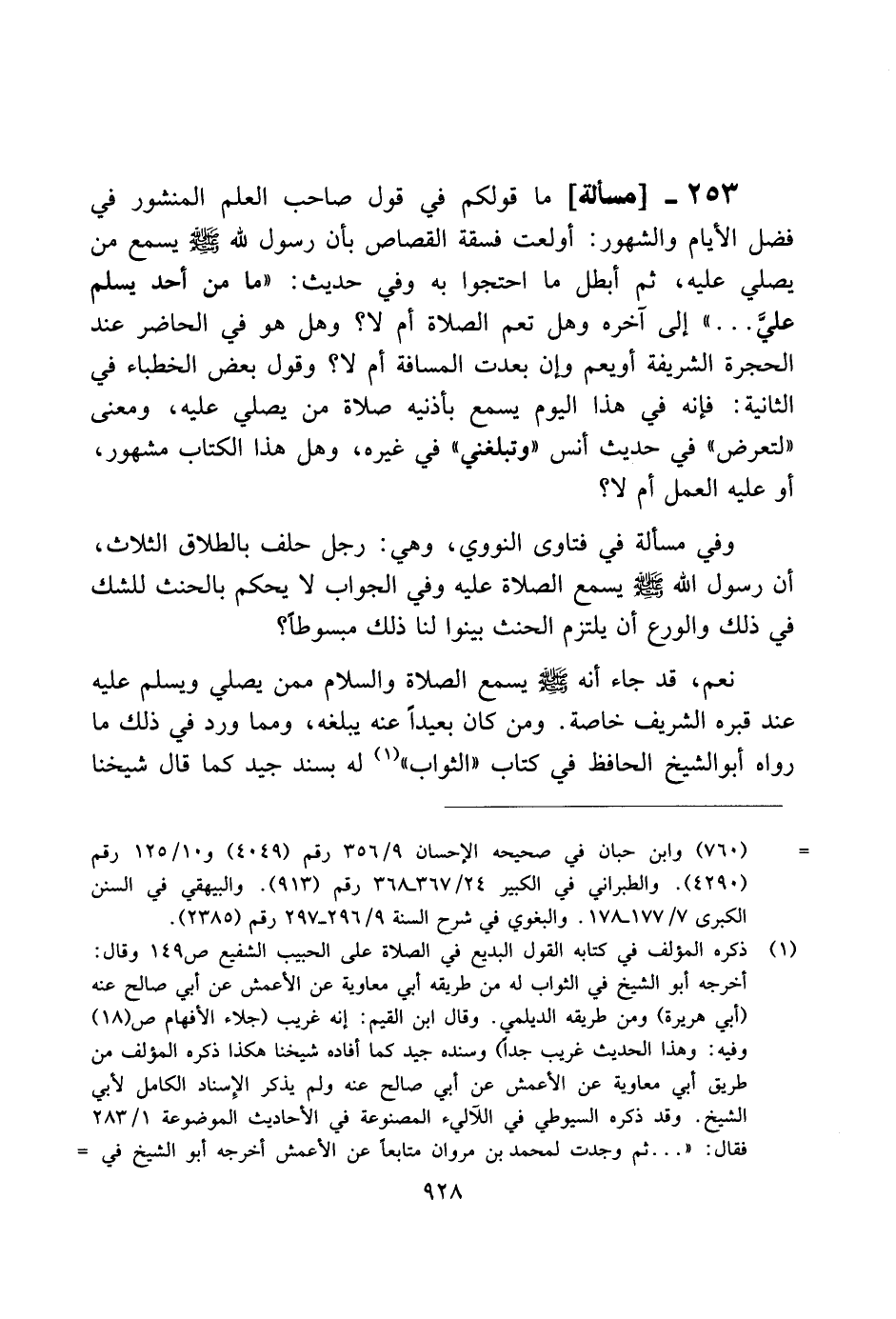 253 - [مسألة] ما قولكم في قول صاحب العلم المنشور في فضل الأيام والشهور: أولعت فسقة القصاص بأن رسول الله صلى الله عليه وسلم يسمع من يصلي عليه، ثم أبطل ما احتجوا به وفي حديث: "ما من أحد يسلم علي ... " إلى آخره وهل تعم الصلاة أم لا؟ وهل هو في الحاضر عند الحرجة الشريفة أو يعم وإن بعدت المسافة أم لا؟ وقول بعض الخطباء في الثانية: فإنه في هذا اليوم يسمع بأذنيه صلاة من يصلي عليه، ومعنى "لتعرض"في حديث أنس "وتبلغني" في غيره، وهل هذا الكتاب مشهور، أو عليه العمل أم لا؟