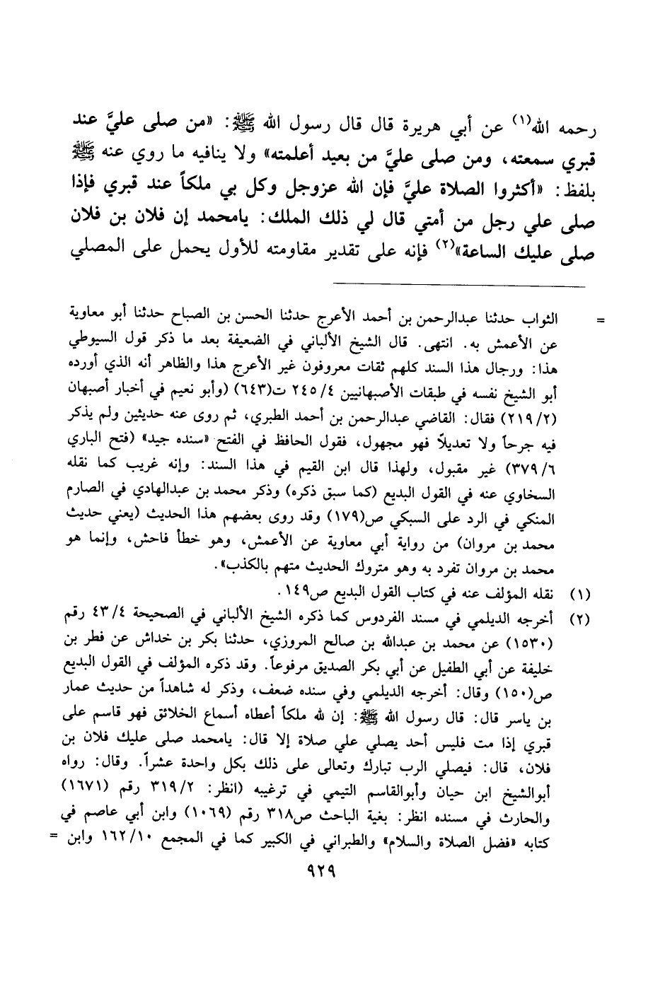 رحمه الله عن أبي هريرة قال قال رسول الله صلى الله عليه وسلم: "من صلى علي عند قبري سمعته، ومن صلى علي من بعيد أعلمته" ولا ينافيه ما روي عنه صلى الله عليه وسلم بلفظ: "أكثروا الصلاة علي فإن الله عز وجل وكل بي ملكًا عند قبري فإذا صلى على رجل من أمتي قال لي ذلك الملك: يا محمد إن فلان بن فلان صلى عليك الساعة" فإنه على تقدير مقاومته للأول يحمل على المصلي