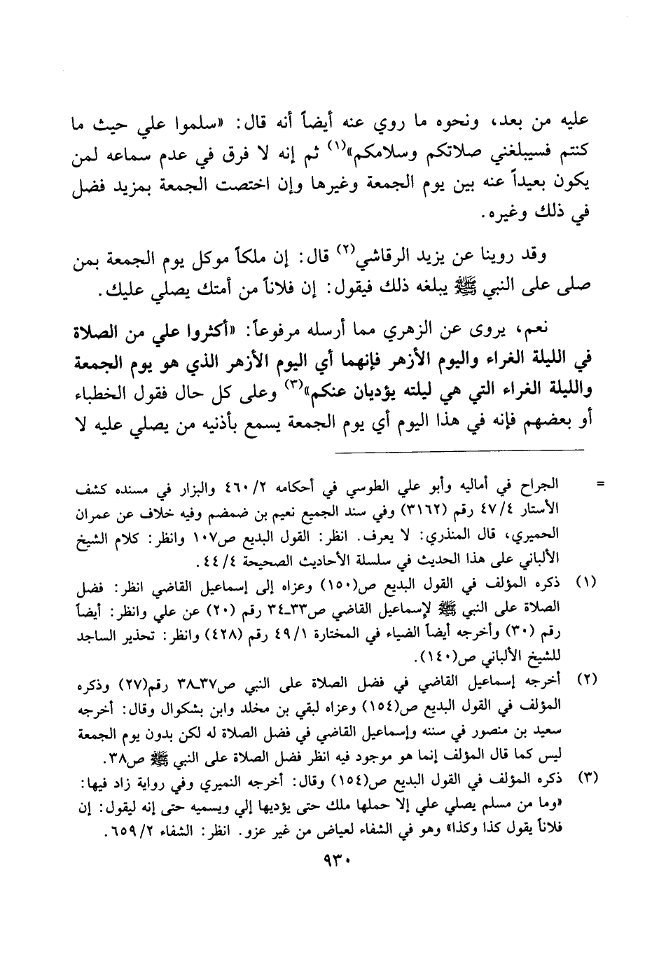 عليه من بعد، ونحوه ما روي عنه أيضًا أنه قال: "سلموا علي حيث ما كنتم فسيبلغني صلاتكم وسلامكم" ثم إنه لا فرق في عدم سماعه لمن يكون بعيدًا عنه بين يوم الجمعة وغيرها وإن اختصت الجمعة بمزيد فضل في ذلك وغيره.