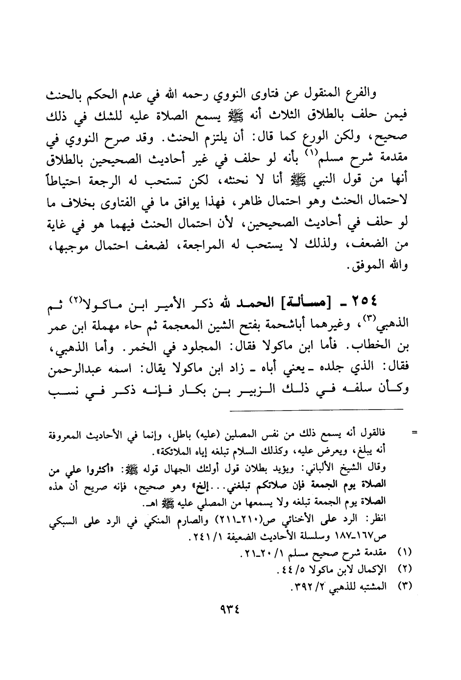 والفرع المنقول عن فتاوي النووي رحمه الله في عدم الحكم باحلنث فيمن حلف بالطلاق الثلاث أنه صلى الله عليه وسلم يسمع الصلاة عليك للشك في ذلك صحيح، ولكن الورع كما قال: أن يلتزم الحنث. وقد صرح النووي في مقدمه شرح مسلم أنه لو حلف في غير أحاديث الصحيحين بالطلاق أنها من قول النبي صلى الله عليه وسلم أنا لا نحنثه، لكن تستحب له الرجعة احتياطًا لاحتمال الحنث وهو احتمال ظاهر، فهذا يوافق ما في الفتاوي بخلاف ما لو حلف في أحاديث الصحيحين، لأن احتمال الحنث فيهما هو في غاية من الضعف، ولذلك لا يستحب له المراجعة، لضعف احتمال موجبها، والهل الموفق.