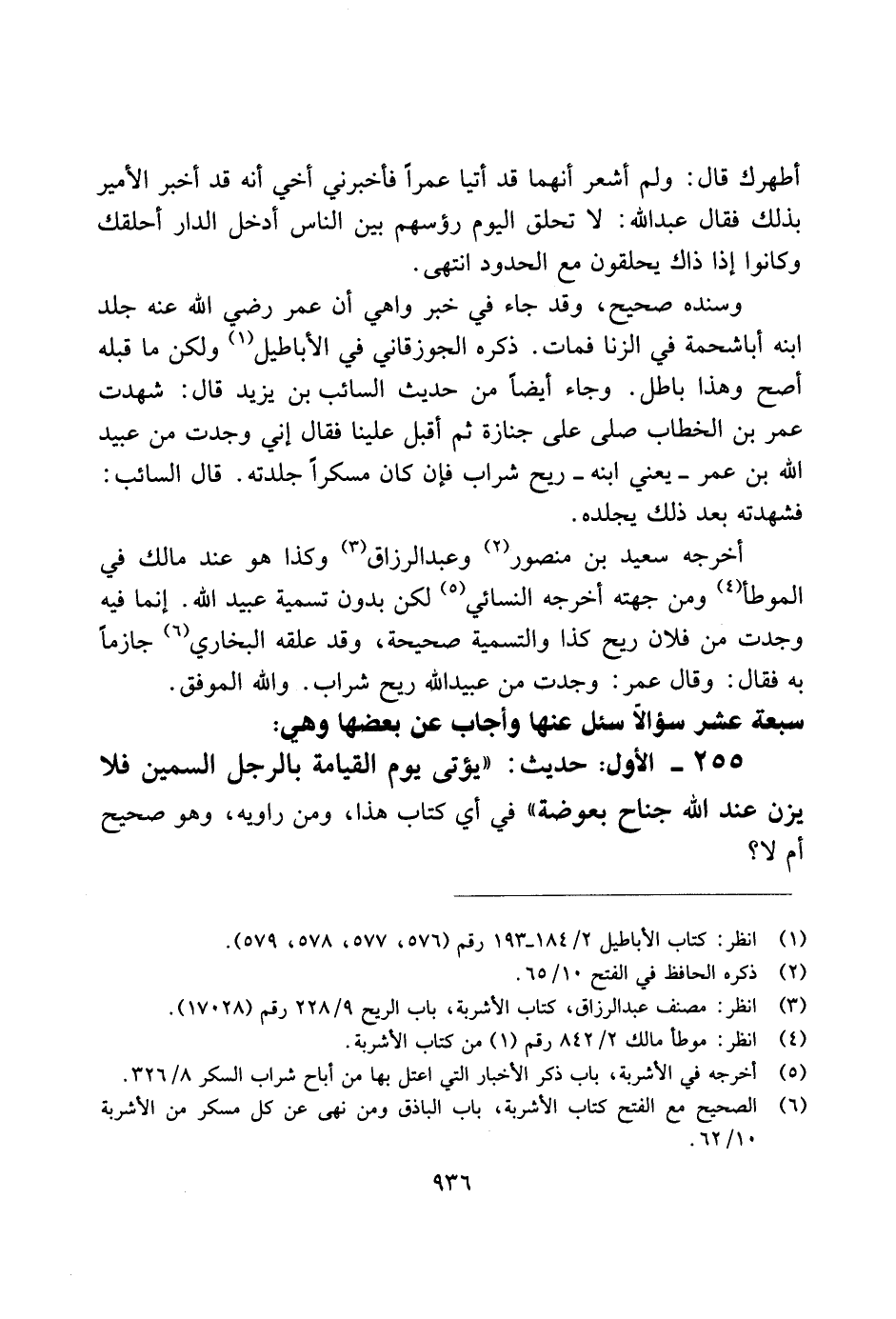 وسنده صحيح، وقد جاء في خبر واهي أن عمر رضي الله عنه جلد ابنه أبا شحمة في الزنا فمات. ذكره الجوزقاني في الأباطيل ولكن ما قبله أصح وهذا باطل. وجاء أيضًا من حديث السائب بن يزيد قال: شهدت عمر بن الخطاب صلى على جنازة ثم أقبل علينا فقال إني وجدت من عبيد الله بن عمر ـ يعني ابنه ـ ريح شراب فإن كان مسكرًا جلدته. قال السائب: فشهدته بعد ذلك يجلده.