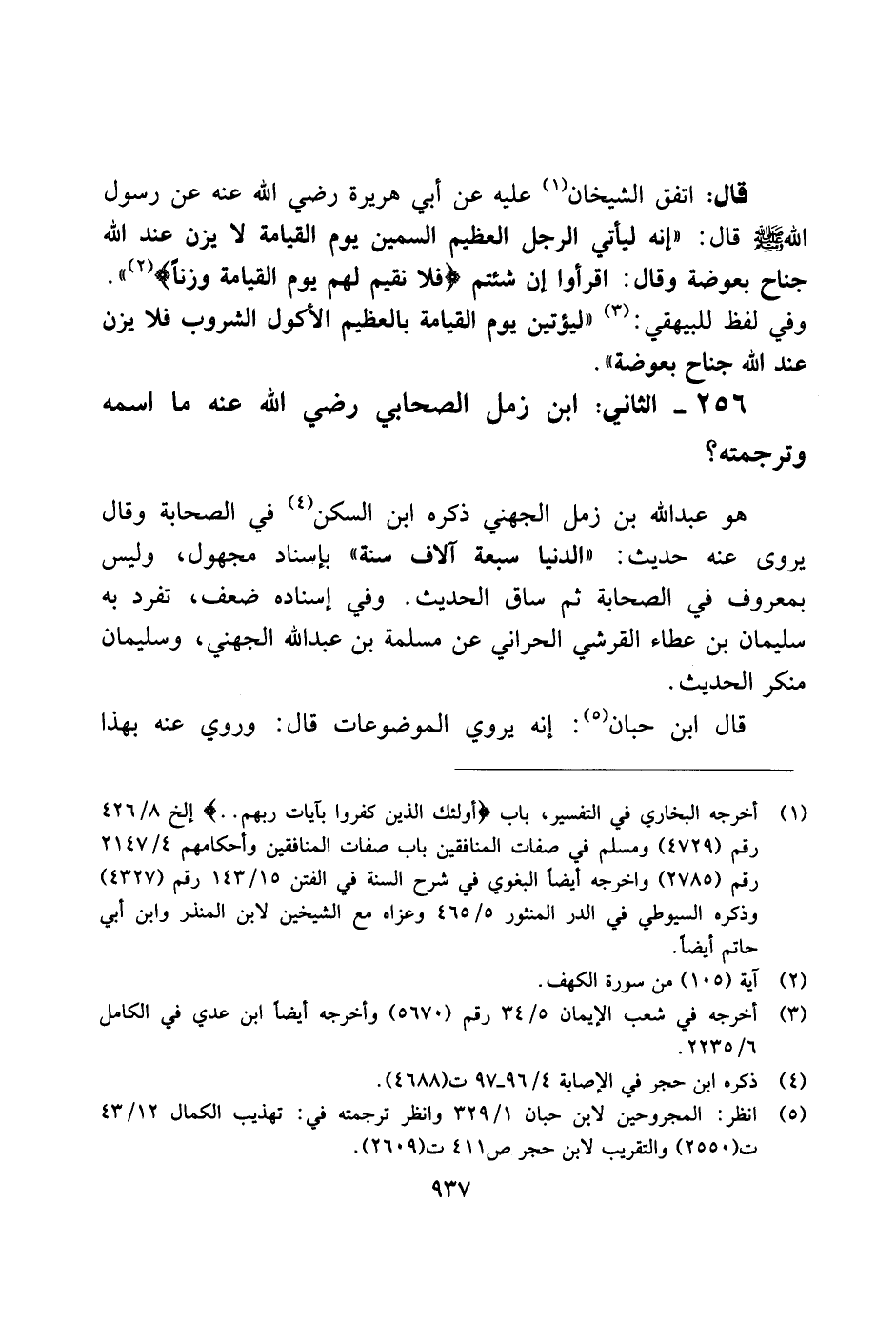 قال: اتفق الشيخان عليه عن أبي هريرة رضي الله عنه عن رسول الله صلى الله عليه وسلم قال: «إنه ليأتي الرجل العظيم السمين يوم القيامة لا يزن عند الله جناح بعوضة وقال: اقرأوا إن شئتم (فلا نقيم لهم يوم القايمة وزنا)». وفي لفظ للبيهقي: «ليؤتين يوم القيامة بالعظيم الأكول الشروب فلا يزن عند الله جناح بعوضة».