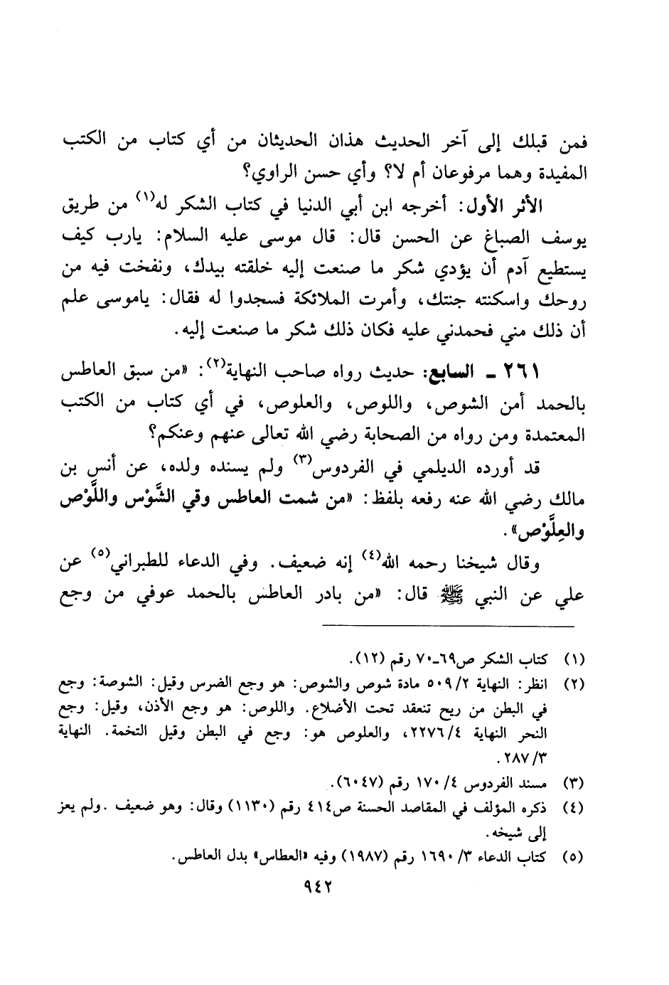 261 - السابع: حديث رواه صاحب النهاية: "من سبق العاطس بالحمد أمن الشوص، واللوص، والعلوص، في أي كتاب من الكتب المعتمدة ومن رواه من الصحابة رضي الله تعالى عنهم وعنكم؟