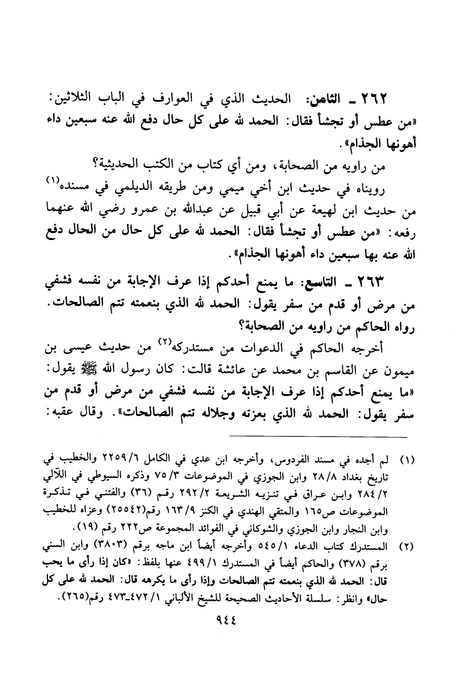 263 - التاسع: ما يمنع أحدكم إذا عرف الإجابة من نفسه فشفي من مرض أو قدم من سفر يقدم: الحمد لله الذي بنعمته تتم الصالحات. رواه الحاكم من روايه من الصحابة؟