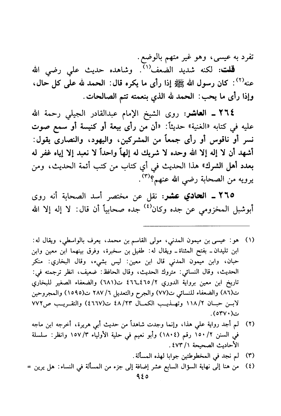 264 - العاشر: روى الشيخ الإمام عبد القادر الجيلي رحمة الله عليه في كتابه "الغنية" حديثًا: "أن من رأى بيعة أو كنيسة أو سمع صوت نسر أو ناقوش أو رأى جمعًا من المشركين، واليهود، والنصارى يقول: أشهد أن لا إله إلا الله وحده لا شريك له إلهًا واحدًا لا نعبد إلا إياه غفر له بعدد أهل الشرك" هذا الحديث في أي كتاب من كتب أئمة الحديث، ومن يرويه من الصحابة رضي الله عنهم؟.