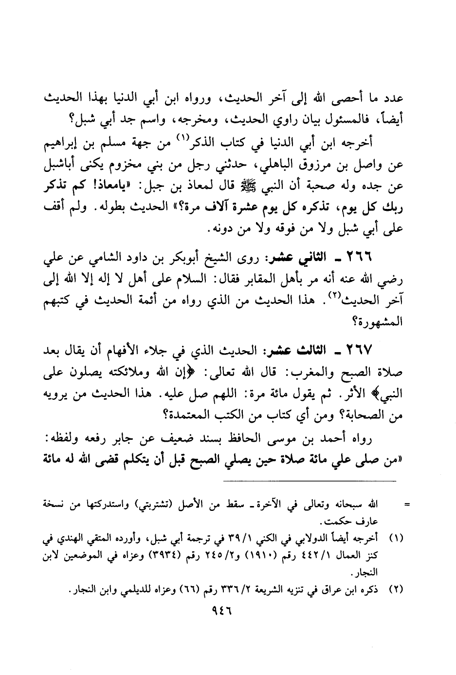 266 - الثاني عشر: روى الشيخ أبو بكر بن داود الشامي عن علي رضي الله عنه أنه مر بأهل المقابل فقال: السلام على أهل لا إله إلا الله إلى آخر الحديث. هذا الحديث من الذي رواه من أئمة الحديث في كتبهم المشهورة؟