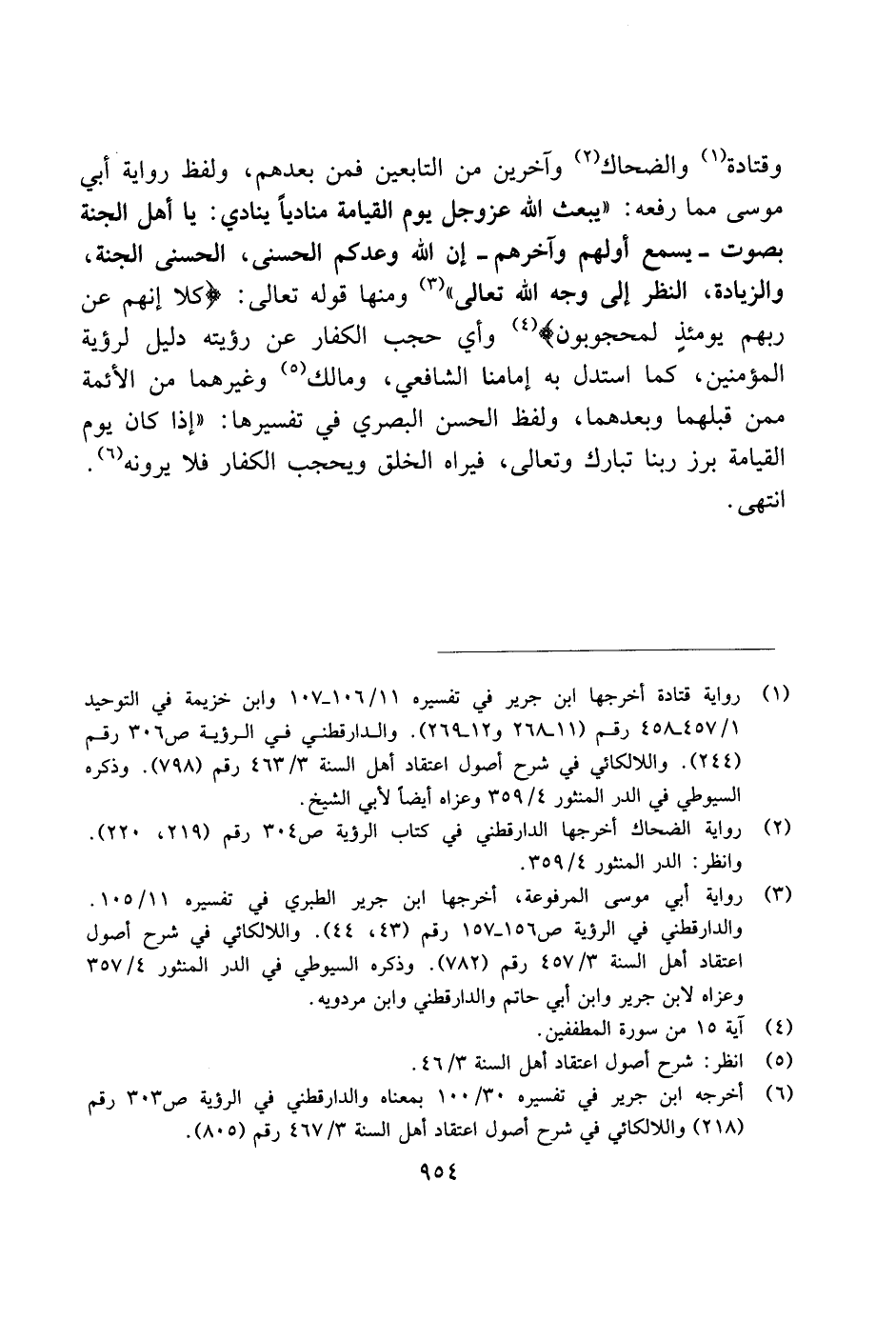 وقتادة والضحاك وآخرين من التابعين فمن بعدهم، ولفظ رواية أبي موسى مما رفعه: "يبعث الله عز وجل يوم القيامة مناديًا ينادي: يا أهل الجنة بصوت ـ يسمع أولهم وآخرهم ـ إن الله وعدكم الحسنى، الحسنى الجنة، والزيادة، النظر إلى وجه الله تعالى" ومنها قوله تعالى: (كلا إنهم عن ربهم يومئذٍ لمحجوبون) وأي حجب الكفار عن رؤيته دليل لرؤية المؤمنين، كما استدل به إمامنا الشافعي، ومالك وغيرهما من الأئمة ممن قبلهما وبعدهما، ولفظ الحسن البصري في تفسيرها: "إذا كان يوم القيامة بزر ربنا تبارك وتعالى، فيراه الخلق ويحجب الكفار فلا يرونه. انتهى.