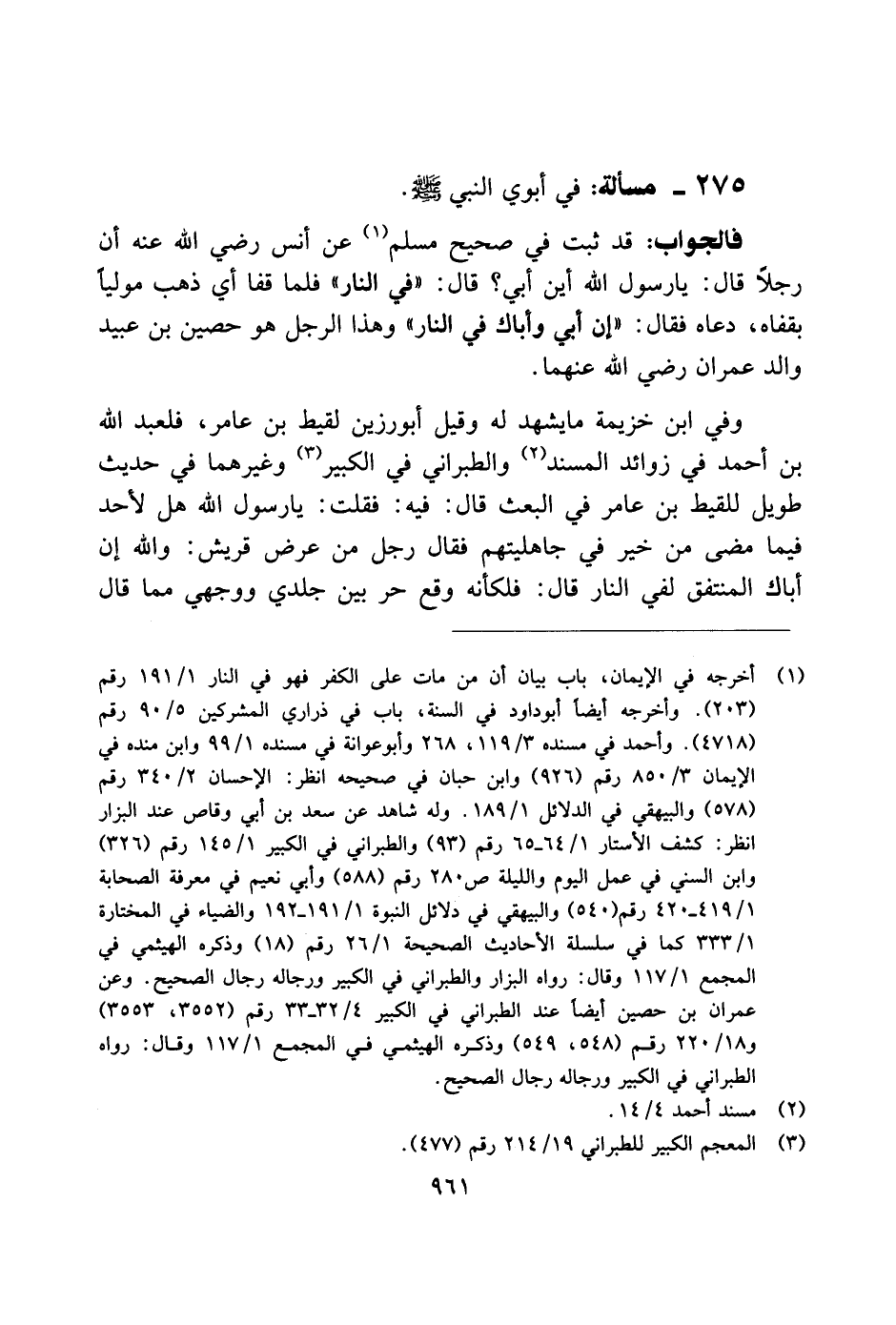 275 - مسألة: في أبوي النبي صلى الله عليه وسلم.