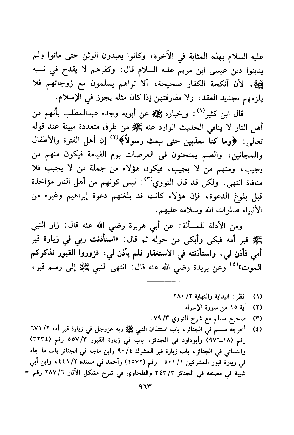 قال ابن كثير: وإخباره صلى الله عليه وسلم عن أبويه وجده عبد المطلب بأنهم من أهل النار لا ينافي الحديث الوارد عنه صلى الله عليه وسلم من طرق متعددة مبينة عند قوله تعالى: (وما كنا معذبين حتى نبعث رسولاً) إن أهل الفترة والأطفال والمجانين، والصم يمتحنون في العرصات يوم القيامة فيكون منهم من يجيب، ومنهم من لا يجيب، فيكون هؤلاء من جملة من لا يجيب فلا منافاة انتهى. ولكن قد قال النووي: ليس كونهم من أهل النار مؤاخذة قبل بلغ الدعوى، فإن هؤلاء كانت قد بلغتهم دعوة إبراهيم وغيره من الأنبياء صلوات الله وسلامه عليهم.