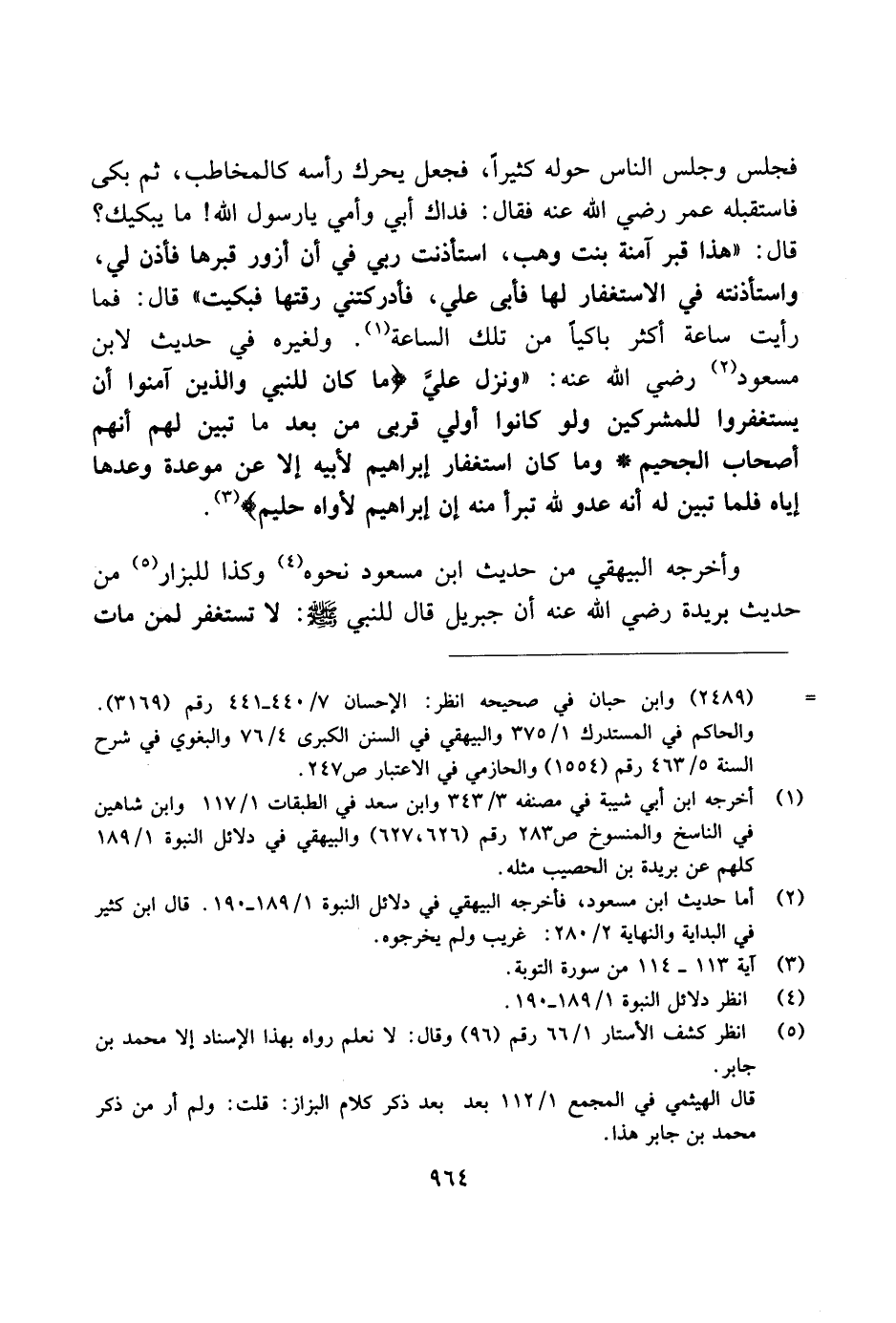 فجلس وجلس الناس حوله كثيرًا، فجعل يحرك راسه كالمخاطب، ثم بكى فاستقبله عمر رضي الله عنه فقال: فذاك أبي وأمي يا رسول الله! ما يبكي:؟ قال: "هذا قبر آمنة بنت وهب، استأذنت ربي في أن أزور قبرها فأذن لي، واستأذننه في الاستغفار لها فأبى علي، فأدركتني رقتها فبكيت" قال: فما رايت ساعة أكثر باكيًا من تلك الساعة. ولغيره في حديث لابن مسعود رضي الله عنه: "ونزول علي (ما كان للنبي والذي آمنوا أن يستغفروا للمشركين ولو كانوا أولي قربى من بعد ما تبين لهم أنهم أصحاب الجحيم وما كان استغفار إبراهيم لأبيه إلا عن موعدة وعدها إياه فلما تبين له أنه عدو لله تبرأ منه إن إبراهيم لأواه حليم".