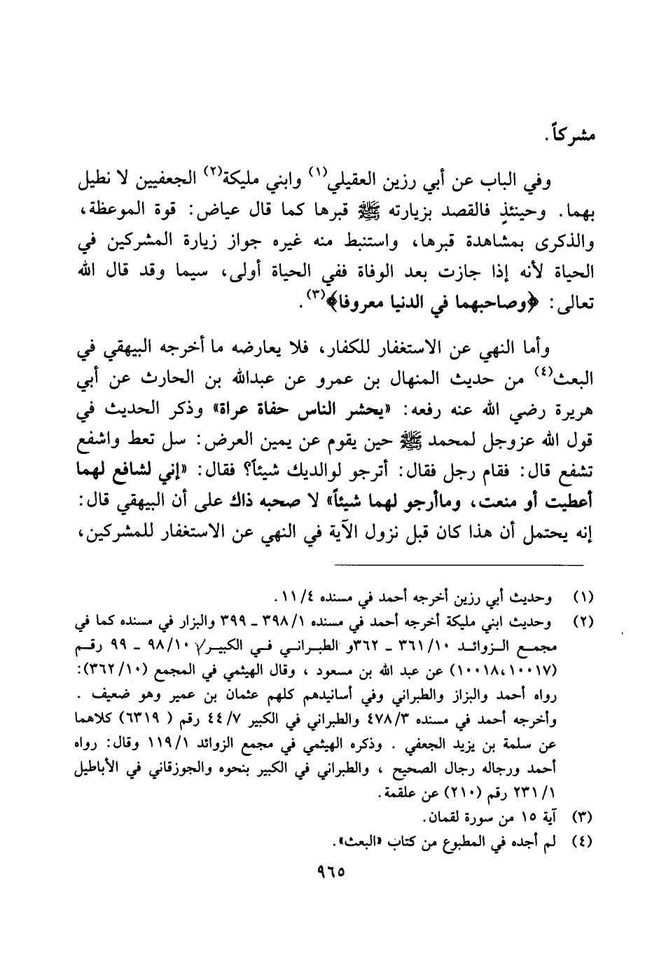 وفي الباب عن أبي رزين العقيل وابني ملكية الجعفيين لا نطيل بهما. وحينئذ فالقصد بزيارته صلى الله عليه وسلم قبرها كما قال عياض، قوة الموعظة، والذكرى بمشاهدة قبرها، واستنبط منه غيره جواز زيارة المشركين في الحياة لأنه إذا جازت بعد الوفاة ففي الحياة الأولى، سيما وقد قال الله تعالى: (وصاحبهما في الدنيا معروفا).