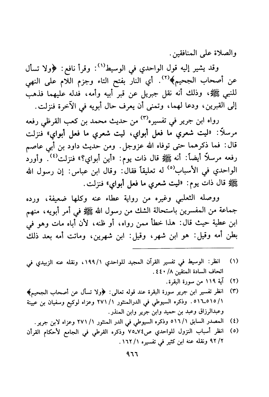 وقد يشير إليه قول الواحدي في الوسيط: وقرأ نافع: (ولا تسأل عن أصحاب الجحيم). أي النار بفتح التاء وجزم اللام على النهي للنبي صلى الله عليه وسلم، وذلك أنه نقل جبريل عن قبر أبيه وأمه، فدله عليهما فذهب إلى القبرين، ودعا لهما، وتمنى أن يعرف حال أبويه في الآخرة فنزلت.