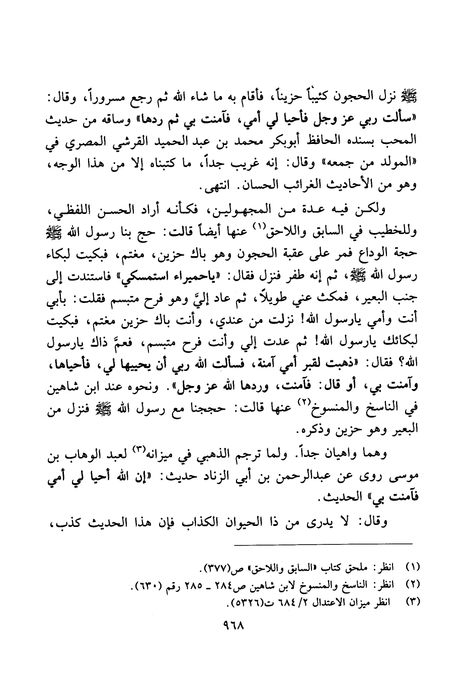 وهما واهيان جدًا. ولما ترجم الذهبي في ميزانه لعبد الوهاب بن موسى روى عن عبد الرحمن بن أبي الزناد حديث: "إن الله أحيا لي أمي فآمنت بي" الحديث.