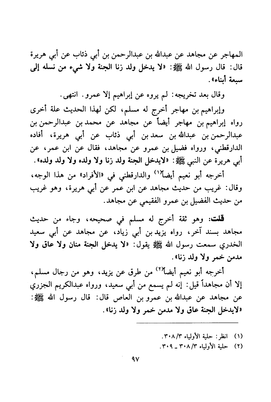 وإبراهيم بن مهاجر أخرج له مسلم، لكن لهذا الحديث علة أخرى رواه إبراهيم بن مهاجر أيضًا عن مجاهد عن محمد بن عبد الرحمن بن عبد الرحمن بن عبد الله بن سعد بن أبي ذئاب عن أبي هريرة، أفاده الدارقطني، ورواه فضيل بن عمرو عن مجاهد، فقال عن ابن عمر، عن أبي هريرة عن النبي صلى الله عليه وسلم: "لا يدخل الجنة ولد زنا ولا ولده ولا ولد ولده".