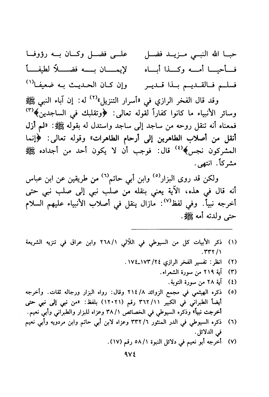 وقد قال الفخر الرازي في "أسرار التنزيل" له: إن آباء النبي صلى الله عليه وسلم وسائر الأنبياء ما كانوا كفارًا لقوله تعالى: (وتقلبك في الساجدين) فمعناه أنه تنقل روحه من ساجد إلى ساجد واستدل له بقوله صلى الله عليه وسلم: (لم أزل أنقل من أصلاب الطاهرين إلى أحارم الطاهرات) وقوله تعالى: (إنما المشركون نجس) قال: فوجب أن لا يكون أحد من أجداده صلى الله عليه وسلم مشركًا. انتهى.