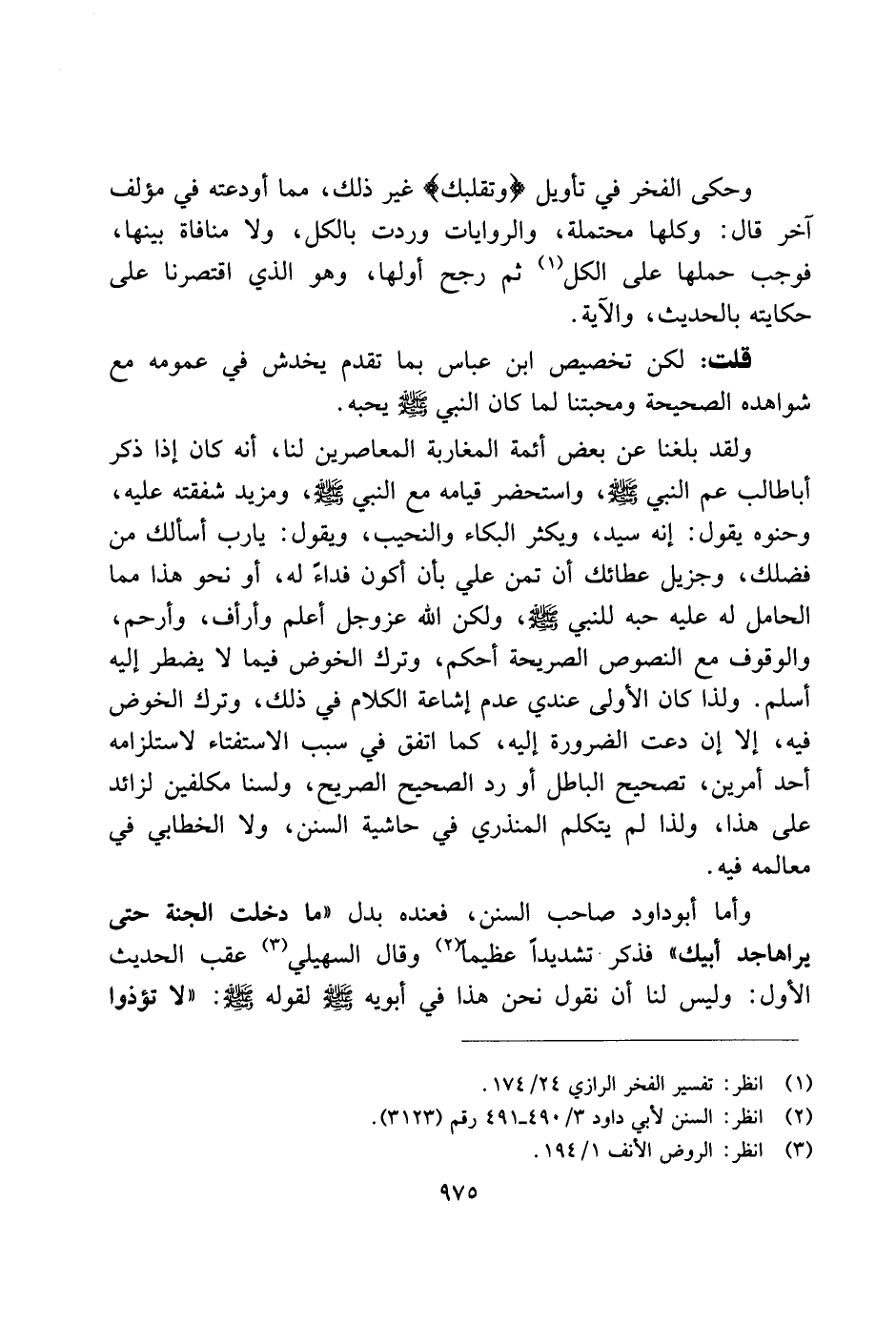 ولقد بلغنا عن بعض أئمة المغاربة المعاصرين لنا، أنه كان إذا ذكر أبا طالب عم النبي صلى الله عليه وسلم، واستحضر قيامه مع النبي صلى الله عليه وسلم، ومزيد شفقته عليه، وحنوه يقول: إنه سيد، ويكثر البكاء والنحيب، ويقول: يا رب أسألك من فضلك، وجزيل عطائك أن تمن علي بأن أكون فداء له، أو نحو هذا مما الحامل له عليه حبه للنبي صلى الله عليه وسلم، ولكن الله عز وجل أعلم وأرأف، وأرحم، والوقوف مع النصوص الصريحة أحكم، وترك الخوض فيما لا يضطر إليه أسلم. ولذا كان الأولى عندي عدم إشاعة الكلام في ذلك، وترك الخوض فيه، إلا إن دعت الضرورة إليه، كما اتفق في سبب الاستفتاء لاستلزامه أحد أمرين، تصحيح البطال أو رد الصحيح الصريح، ولسنا مكلفين لزائد على هذا، ولذا لم يتكلم المنذري في حاشية السنن، ولا الخطابي في معالمه فيه.