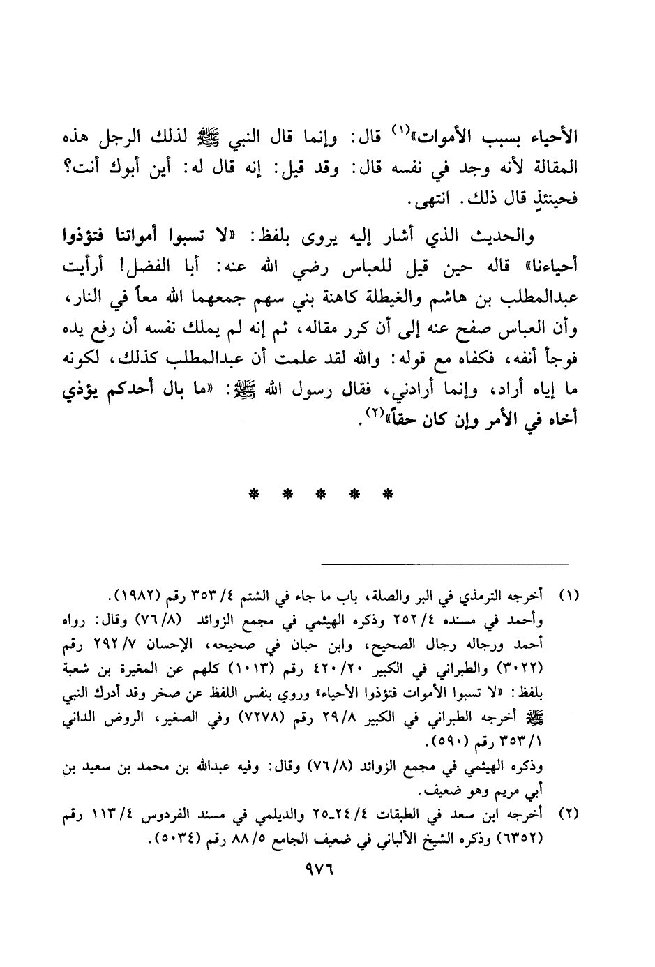 والحديث الذي اشار إليه يروى بلفظ: "لا تسبوا أمواتنا فتؤذوا أحياءنا" قاله حين قيل للعباس رضي الله عنه: أبا الفضل! أرأيت عبد المطلب بن هاشم والغيطلة كاهنة بني سهم جمعهما الله معًا في النار، وأن العباس صفح عنه إلى أن كرر مقاله، ثم إنه لم يملك نفسه أن رفع يده فوجًا أنفه، فكفاه مع قوله: والله لقد علمت أن عبد المطلب كذلك، لكونه ما إياه أراد، وإنما أرادني، فقال رسول الله صلى الله عليه وسلم: "ما بال أحدكم يؤذي أخاه في الأمر وإن كان حقًا".