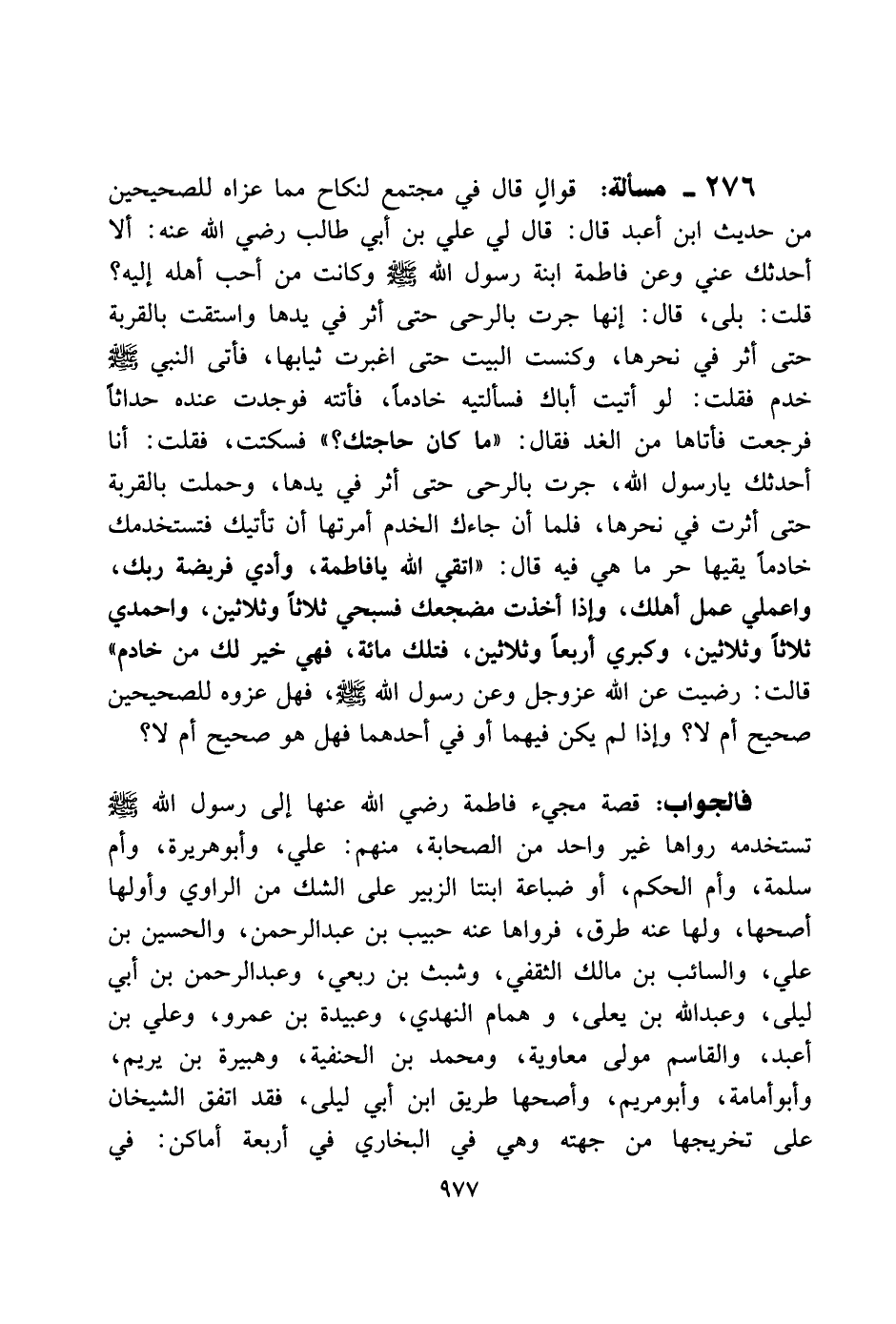 276 - مسألة: قوال قال في مجتمع لنكاح مما عزاه للصحيحين من حديث ابن أعبد قال: قال لي علي بن أبي طالب رضي الله عنه: ألا أحدثك عني وعن فاطمة ابنة رسول الله صلى الله عليه وسلم وكانت من أحب أهله إليه؟ قلت: بلى، قال: إنهاجرت بالرحي حتى أثر في يدها واستقت بالقرية حتى أثر في نحرها، وكنست البيت حتى اغبرت ثيابها، فأتى النبي صلى الله عليه وسلم خدم فقلت: لو أتيت أباك فسألتيه خادمًا، فأتته فوجدت عنده حداثًا فرجعت فأتاها من الغد فقال: "ما كان حاجتك؟ " فسكتت، فقلت: أنا أحدثك يا رسول الله، جرت بالرحي حتى أثر في يدها، وحملت بالقرية حتى أثرت في نحرها، فلما أن جاءك الخدم أمرتها أن تأتيك فتستخدمك خادمًا يقيها حر ما هي فيه قال: "اتقي الله يا فاطمة، وأدي فريضة ربك، واعملي عمل أهلك، وإذا أخذت مضجعك فسبحي ثلاثًا وثلاثين، واحمدي ثلاثًا وثلاثين، وكبري أربعًا وثلاثين، تلك مائة، هي خير لك من خادم" قالت: رضيت عن الله عز وجل وعن رسول الله صلى الله عليه وسلم، فهل عزوه للصحيحين صحيح أم لا؟ وإذا لم يكن فيهما أو في أحدهما فهل هو صحيح أم لا؟