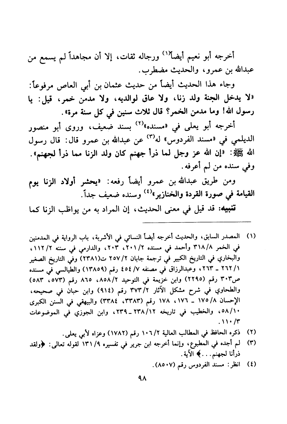 ومن طريق عبد الله بن عمرو أيضًا رفعه: "يحشر أولاد الزنا يوم القيامة في صورة القردة والخنازير" وسنده ضعيف جدًا.
