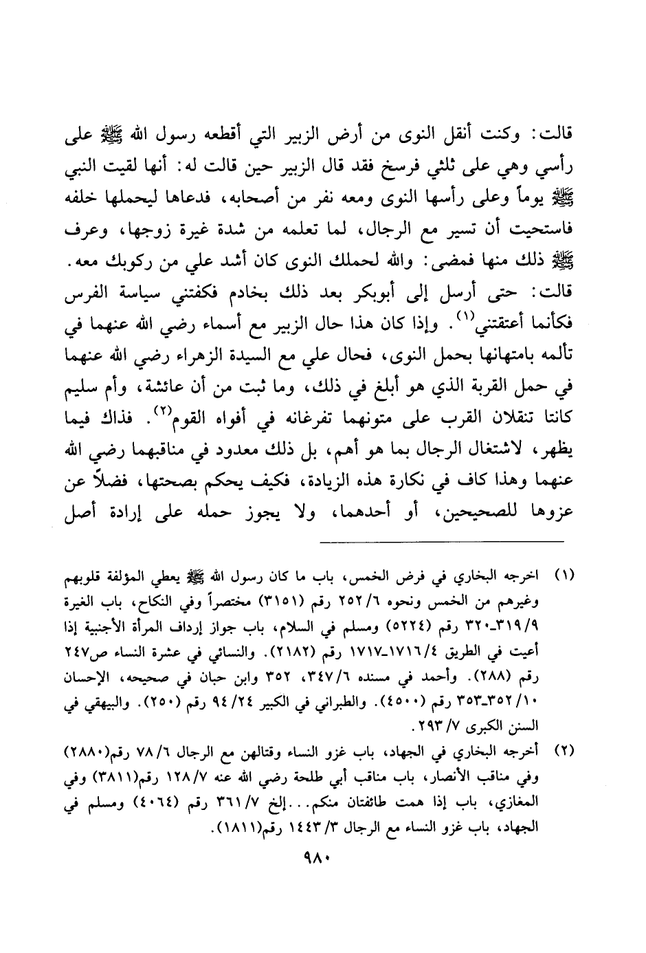 قالت: وكنت أنقل النوى من أرض الزبير التي أقطعه رسول الله صلى الله عليه وسلم على راسي وهي على ثلثي فرسخ فقد قال الزبير حين قالت له: أنها لقيت النبي صلى الله عليه وسلم يومًا وعلى رأسها النوى ومعه نفر من أصحابه، فدعاها ليحملها خلفه فاستحيت أن تسير مع الرجال، لما تعلمه من شدة غيرة زوجها، وعرف صلى الله عليه وسلم ذلك منها فمضى: والله لحملك النوى كان أشد علي من ركوبك معه. قالت: حتى أرسل إلى أبو بكر بعد ذلك بخادم فكفتني سياسة الفرس فكأنما أعتقتني. وإذا كان هذا حال الزبير مع أسماء رضي الله عنهما في تأمله بامتهانها بحمل النوى، فحال علي مع السيدة الزهراء رضي الله عنهما في حمل القربة الذي هو أبلغ في ذلك، وما ثبت من أن عائشة، وأم سليم كانتا تنقلان القرب على متونهما تفرغانه في أفواه القوم. فذاك فيما يظهر، لاشتغال الرجال بما هو أهم، بل ذلك معدود في مناقبهما رضي الله عنهما وهذا كاف في نكارة هذه الزيادة، فكيف يحكم بصحتها، فضلاً عن عزوها للصحيحين، أو أحدهما، ولا يجوز حمله على إرادة أصل