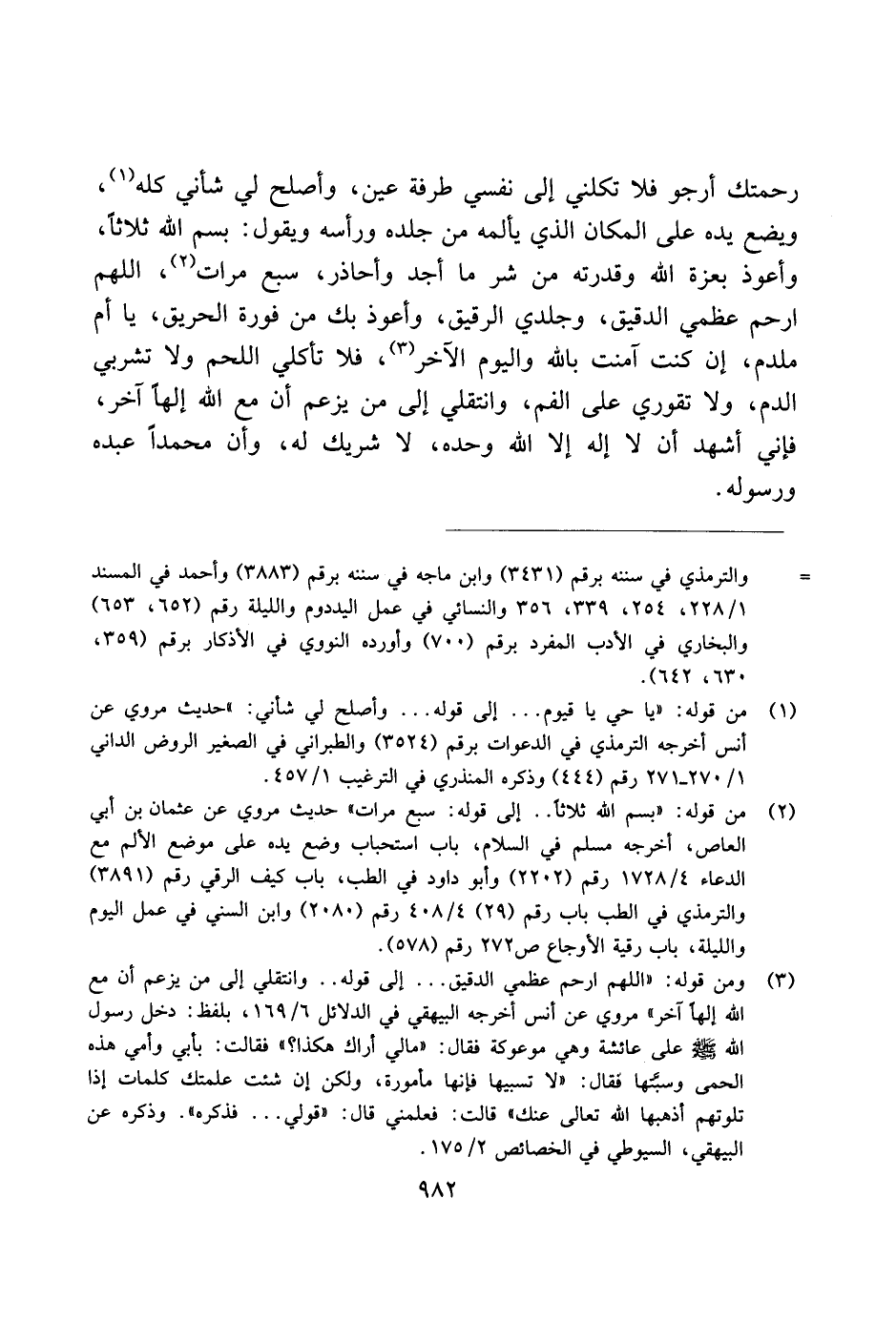 رحمتك أرجو فلا تلكني إلى نفسي طرفه عين، وأصلح لي شأني كله، ويضع يده على المكان الذي يألمه من جلده ورأسه ويقول: بسم الله ثلاثًا، وأعوذ بعزة الله وقدرته من شر ما أجد وأحاذر، سبع مرات، اللهم ارحم عظمي الدقيق، وجلدي الرقيق، وأعوذ بك من فورة الحريق، يا أم ملدم، إن كنت آمنت بالله واليوم الآخر، فلا تأكلي اللحم ولا تشربي الدم، ولاتقوري على الفم، وانتقلي إلى من يزعم أن مع الله إلهًا آخر، فإني أشهد أن لا إله إلا الله وحده، لا شريك له، وأن محمدًا عبده ورسوله.