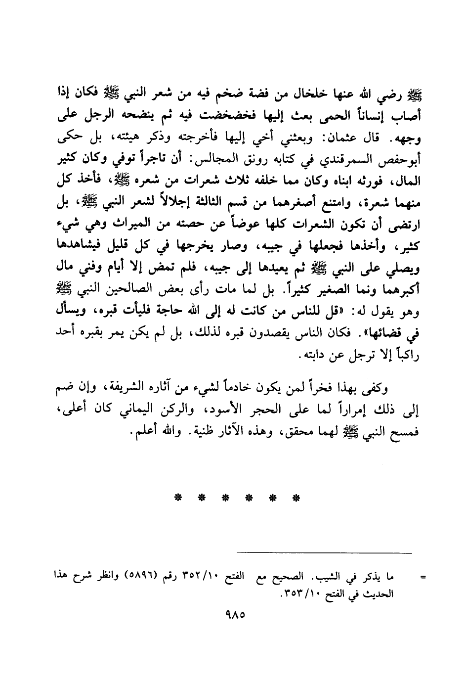 صلى الله عليه وسلم رضي الله عنها خلخال من فضة ضخم فيه من شعر النبي صلى الله عليه وسلم فكان إذا أصاب إنسانًا الحمى بعث إليها فخضخضت فيه ثم ينضحه الرجل على وجهه. قال عثمان: وبعثني أخي إليها فأخرجته وذكر هيئته، بل حكى أبو حفص السمرقندي في كتابه رونق المجالس: أن تاجرًا توفي وكان كثير المال، فورثه ابناه وكان مما خلفه ثلاث شعران من شعره صلى الله عليه وسلم، فأخذ كل منهما شعرة، وامتنع أصغرهما من قسم الثالثة إجلالاً لشعر النبي صلى الله عليه وسلم، بل ارتضى أن تكون الشعرات كلها عوضًا عن حصته من الميراث وهي شيء كثير، وأخذها فجعلها في جيبه، وصار يخرجها في كل قليل فيشاهدها ويصلي على النبي صلى الله عليه وسلم ثم يعيدها إلى جيبه، فلم تمض إلا أيام وفني مال أكبرهما ونما الصغير كثيرًا. بل لما مات رأى بعض الصالحين النبي صلى الله عليه وسلم وهو يقول له: "قل للناس من كانت له إلى الله حاجة فليأت قبره، ويسأل في قضائها". فكان الناس يقصدون قبره لذلك، بل لم يكن يمر بقبره أحد راكبًا إلا ترجل عن دابته.